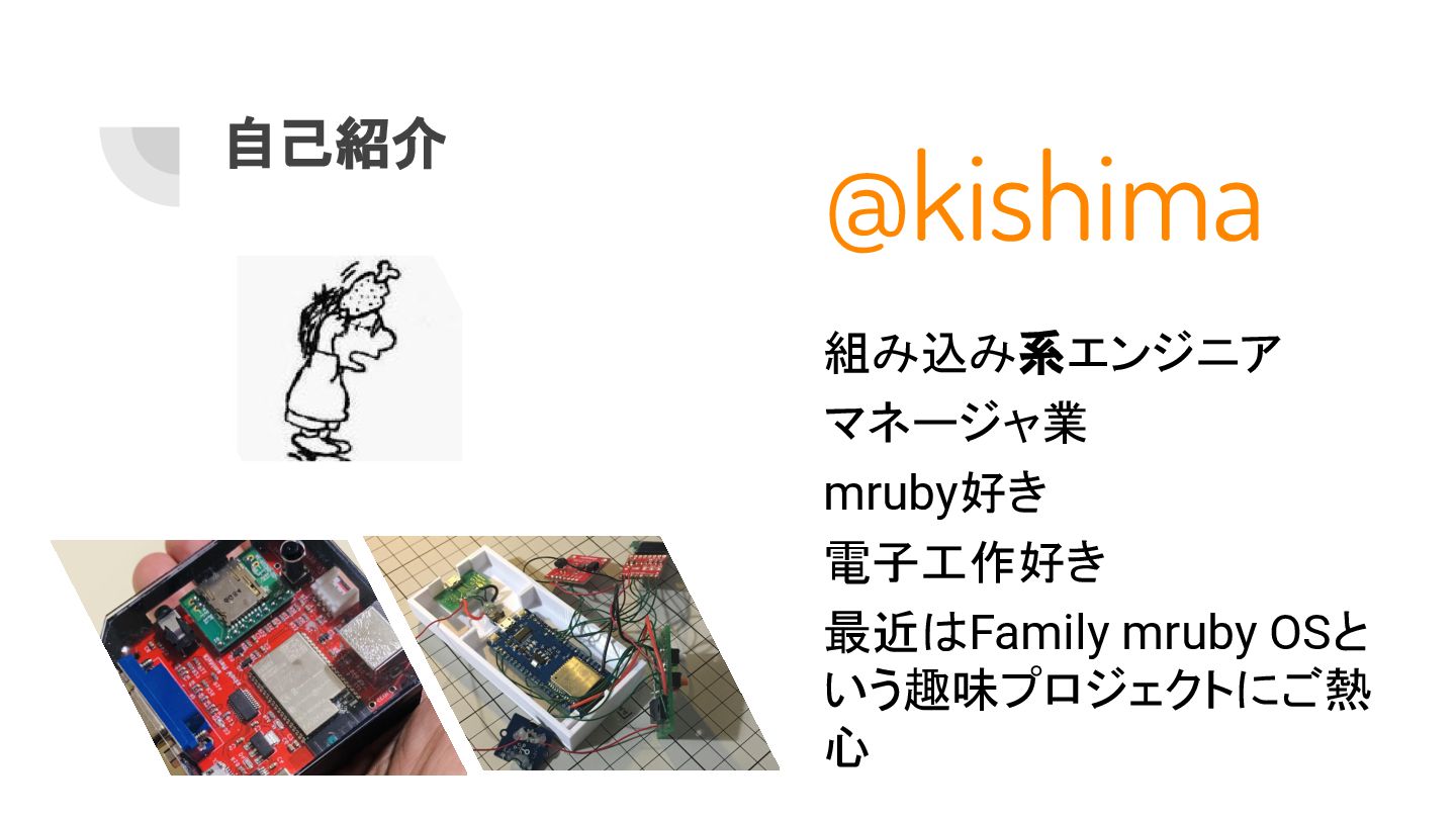自己紹介 @kishima 組み込み系エンジニア マネージャ業 mruby好き 電子工作好き 最近はFamily mruby OSと いう趣味プロジェクトにご熱