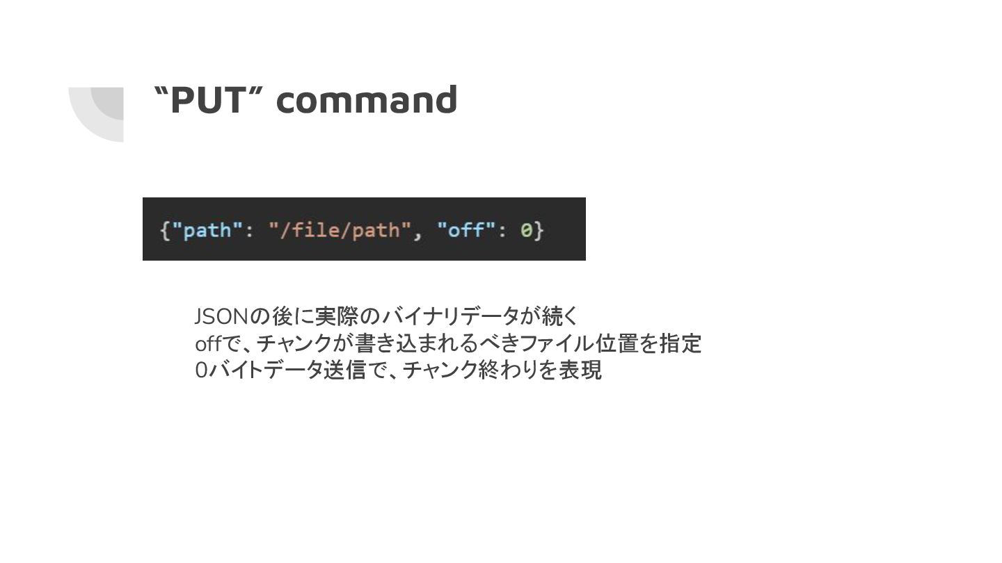 “PUT” command JSONの後に実際のバイナリデータが続く offで、チャンクが書き込まれるべきファイル位置を指定 0バイトデータ送信で、チャンク終わりを表現