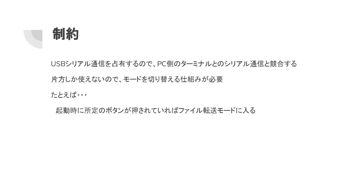 制約 USBシリアル通信を占有するので、PC側のターミナルとのシリアル通信と競合する 片方しか使えないので、モードを切り替える仕組みが必要 たとえば・・・ 起動時に所定のボタンが押されていればファイル転送モードに入る