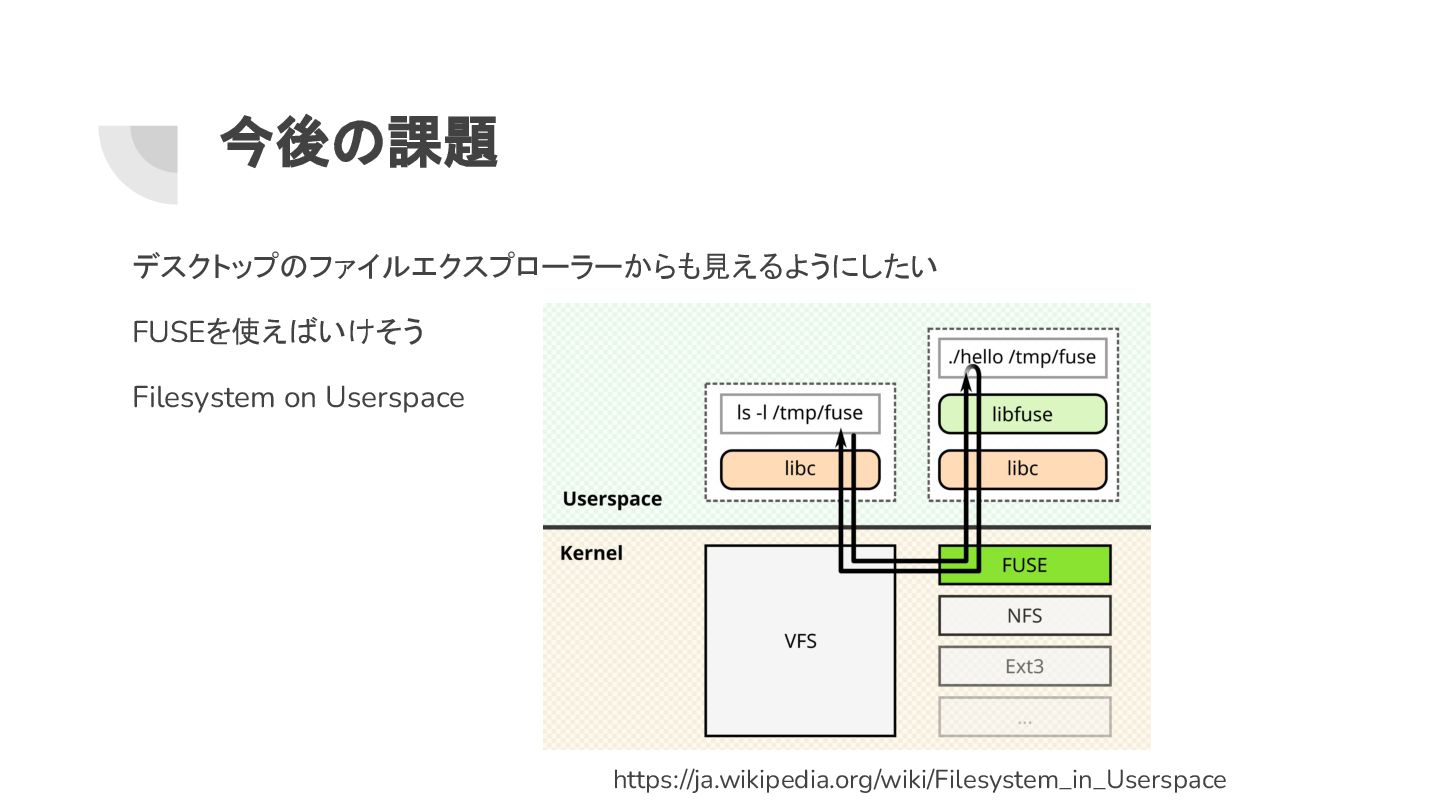 今後の課題 デスクトップのファイルエクスプローラーからも見えるようにしたい FUSEを使えばいけそう Filesystem on Userspace https://ja.wikipedia.org/wiki/Filesystem_in_Userspace