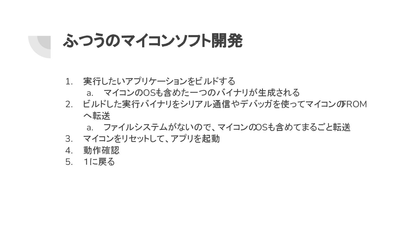 ふつうのマイコンソフト開発 1. 実行したいアプリケーションをビルドする a. マイコンのOSも含めた一つのバイナリが生成される 2. ビルドした実行バイナリをシリアル通信やデバッガを使ってマイコンの FROM へ転送 a.