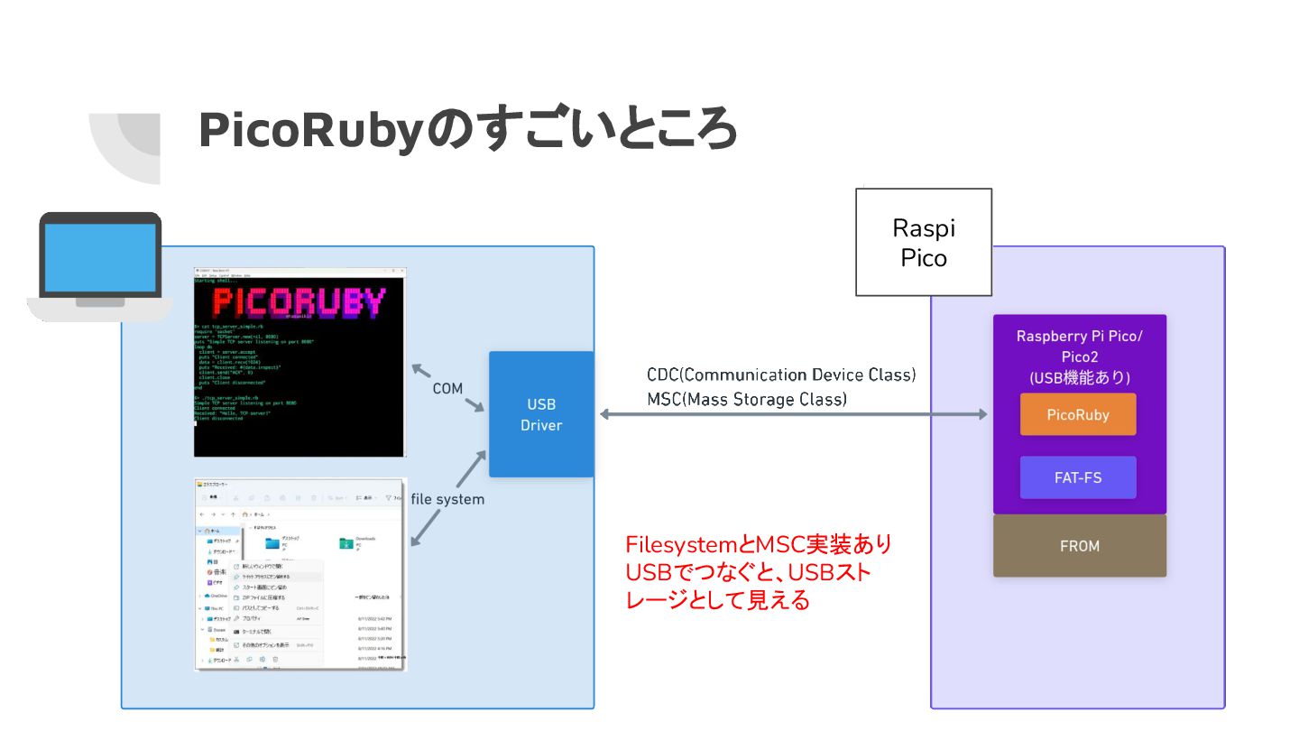 PicoRubyのすごいところ FilesystemとMSC実装あり USBでつなぐと、USBスト レージとして見える Raspi Pico