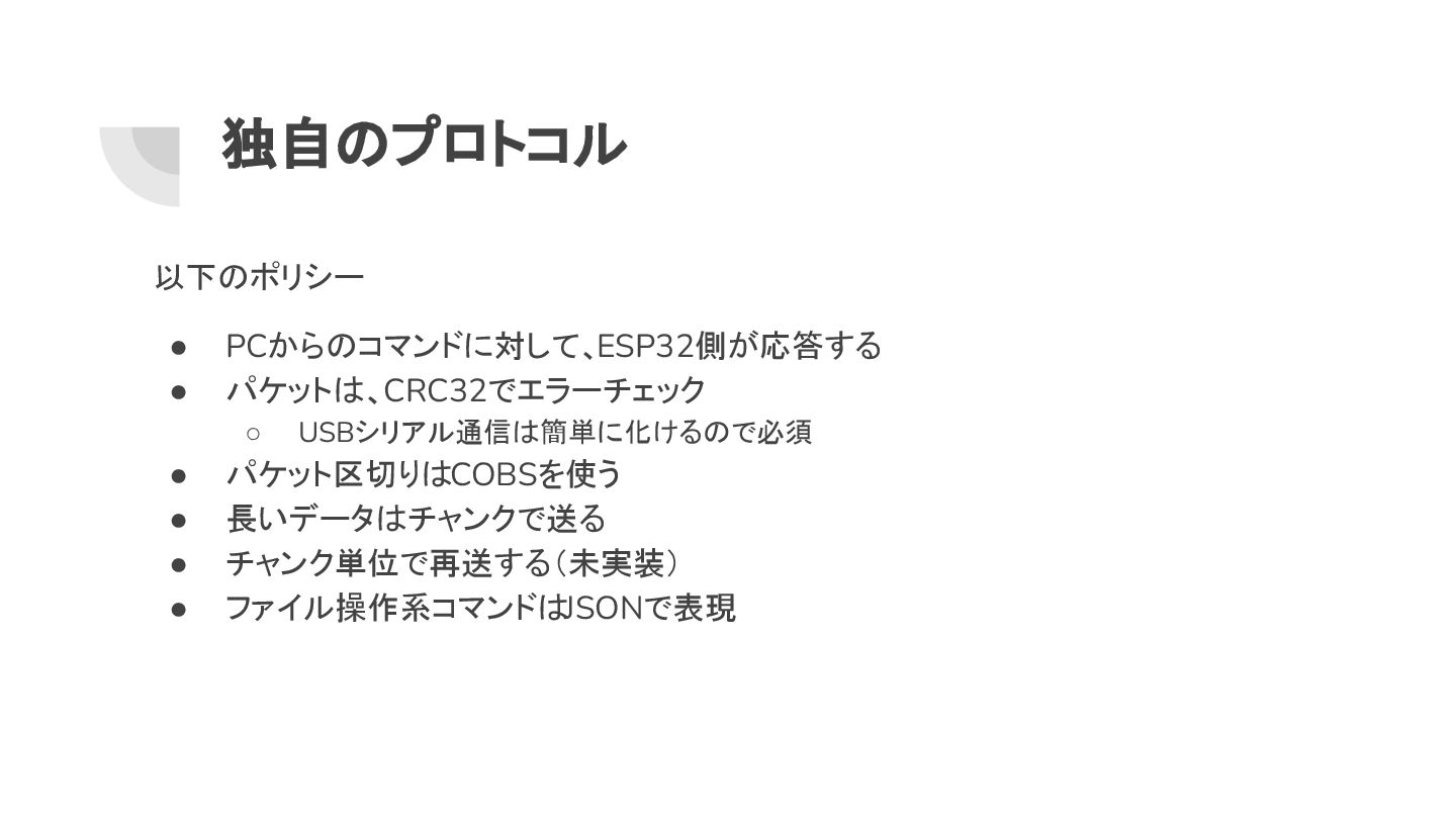 独自のプロトコル 以下のポリシー • PCからのコマンドに対して、ESP32側が応答する • パケットは、CRC32でエラーチェック ◦ USBシリアル通信は簡単に化けるので必須 • パケット区切りはCOBSを使う