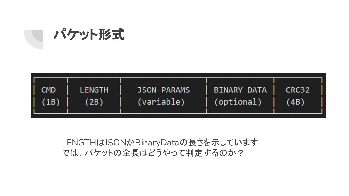 パケット形式 LENGTHはJSONかBinaryDataの長さを示しています では、パケットの全長はどうやって判定するのか?