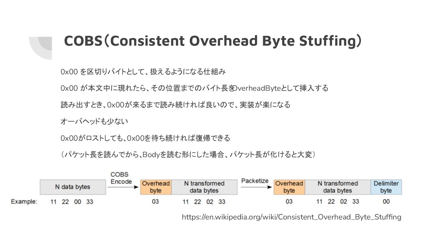 COBS(Consistent Overhead Byte Stuffing) 0x00 を区切りバイトとして、扱えるようになる仕組み 0x00 が本文中に現れたら、その位置までのバイト長を OverheadByteとして挿入する 読み出すとき、0x00が来るまで読み続ければ良いので、実装が楽になる