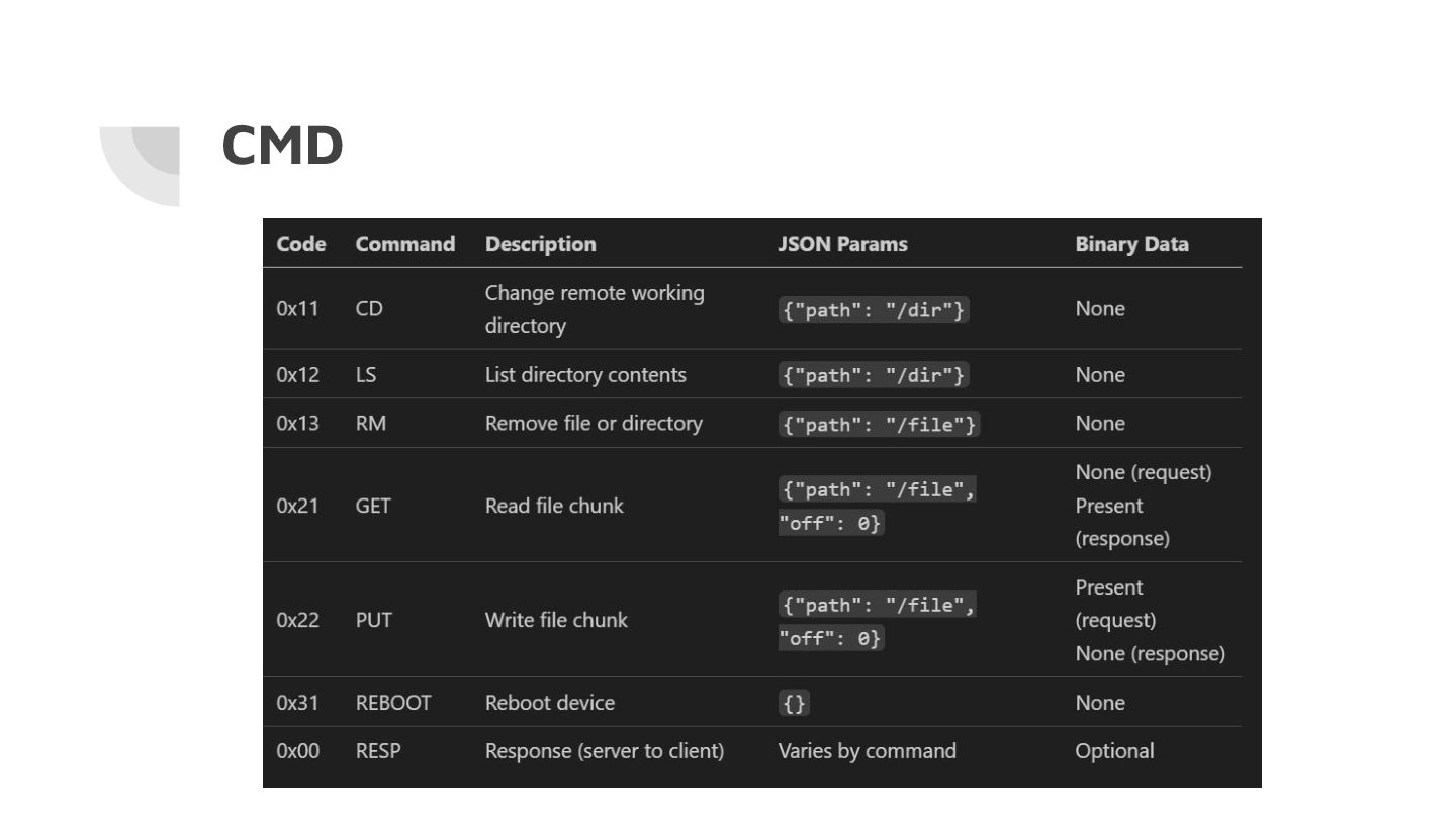 • 長いデータはチャンクで送る • チャンク単位で再送する(未実装) • ファイル操作系コマンドはJSONで表現