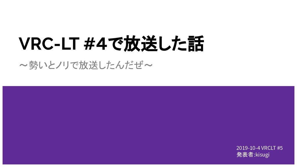 VRC-LT #4で放送した話 ~勢いとノリで放送したんだぜ~ 2019-10-4 VRCLT #5 発表者:kisugi