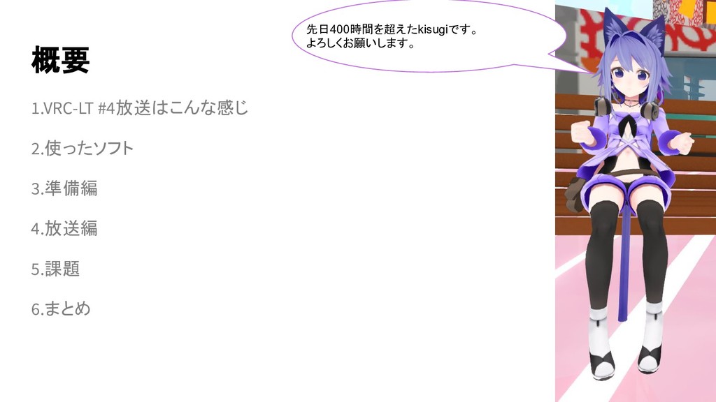 概要 1.VRC-LT #4放送はこんな感じ 2.使ったソフト 3.準備編 4.放送編 5.課題 6.まとめ 先日400時間を超えたkisugiです。 よろしくお願いします。