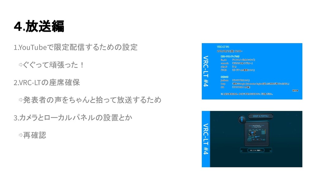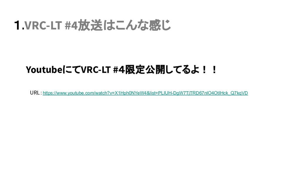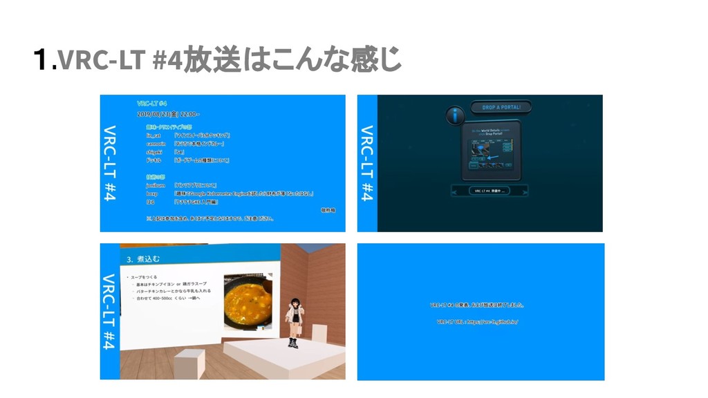 1.VRC-LT #4放送はこんな感じ YoutubeにてVRC-LT #4限定公開してるよ!! URL:https://www.youtube.com/watch?v=X1Hph0NYeW4&list=PLIUH-DgW7TjTRD67nlO4OtIHck_Q7kqVD