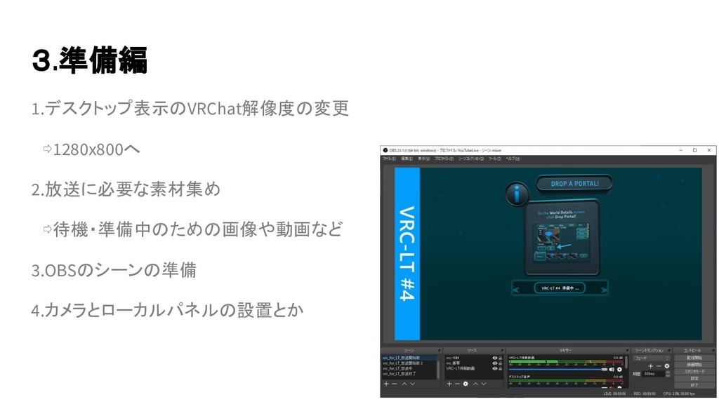 3.準備編 1.デスクトップ表示のVRChat解像度の変更 ⇨1280x800へ 2.放送に必要な素材集め ⇨待機・準備中のための画像や動画など 3.OBSのシーンの準備 4.カメラとローカルパネルの設置とか