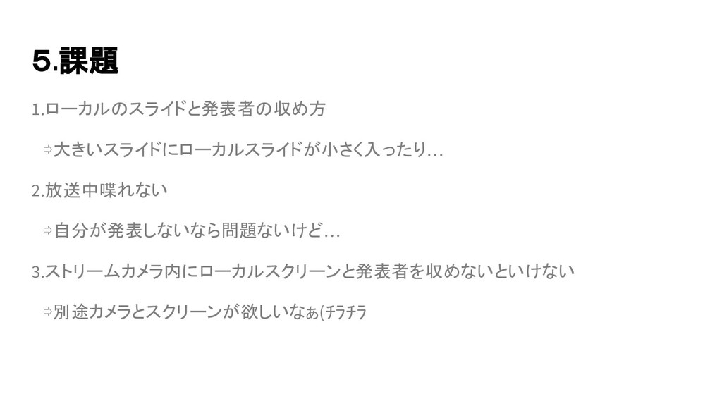 5.課題 1.ローカルのスライドと発表者の収め方 ⇨大きいスライドにローカルスライドが小さく入ったり… 2.放送中喋れない ⇨自分が発表しないなら問題ないけど… 3.ストリームカメラ内にローカルスクリーンと発表者を収めないといけない ⇨別途カメラとスクリーンが欲しいなぁ(チラチラ