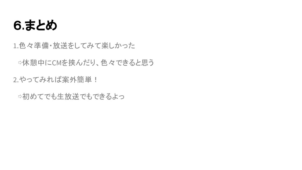 6.まとめ 1.色々準備・放送をしてみて楽しかった ⇨休憩中にCMを挟んだり、色々できると思う 2.やってみれば案外簡単! ⇨初めてでも生放送でもできるよっ