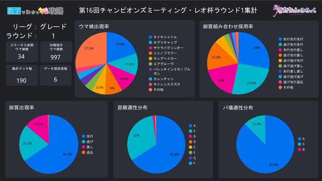 0 200 400 600 800 1,000 1,200 スピード スタミナ パワー 根性 賢さ (パワ+賢)/2 0 200 400 600 800 1,000 1,200 スピード スタミナ パワー 根性 賢さ (パワ+賢)/2 0 200 400 600 800 1,000 1,200 スピード スタミナ パワー 根性 賢さ (パワ+賢)/2 0 200 400 600 800 1,000 1,200 スピード スタミナ パワー 根性 賢さ (パワ+賢)/2 0 200 400 600 800 1,000 1,200 19.8 11.6 9.0 10.4 ステータス分布 タイキシャトルステータス分布 オグリキャップステータス分布 サクラバクシンオーステータス分布 ニシノフラワーステータス分布 タイキシャトル 使用率1位 オグリキャップ 使用率2位 ニシノフラワー 使用率4位 サクラバクシンオー 使用率3位 1 グレード % % % %