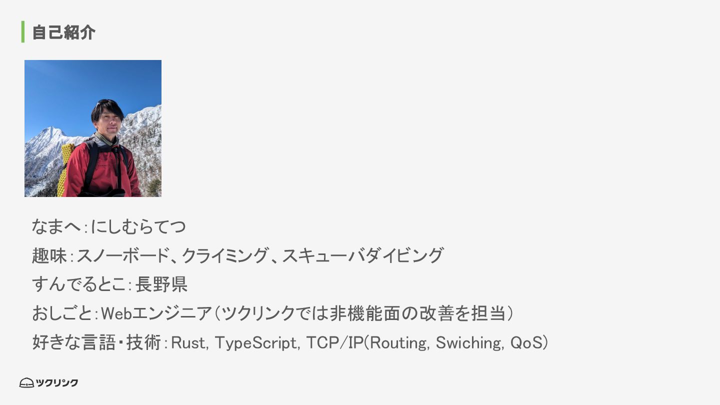 自己紹介 なまへ:にしむらてつ 趣味:スノーボード、クライミング、スキューバダイビング すんでるとこ:長野県 おしごと:Webエンジニア(ツクリンクでは非機能面の改善を担当) 好きな言語・技術:Rust, TypeScript, TCP/IP(Routing, Swiching,