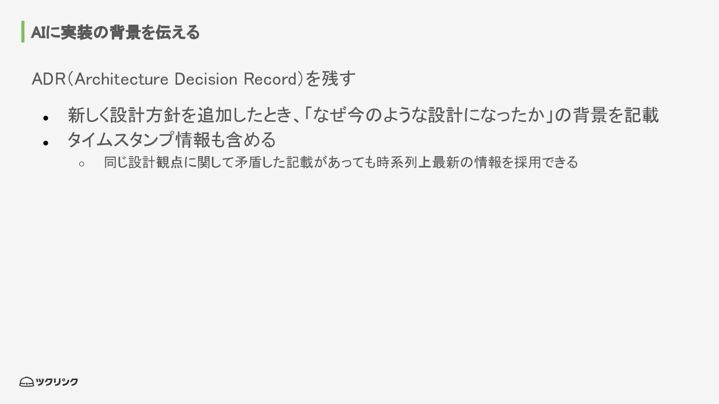 AIに実装の背景を伝える ADR(Architecture Decision Record)を残す • 新しく設計方針を追加したとき、「なぜ今のような設計になったか」の背景を記載 • タイムスタンプ情報も含める ◦