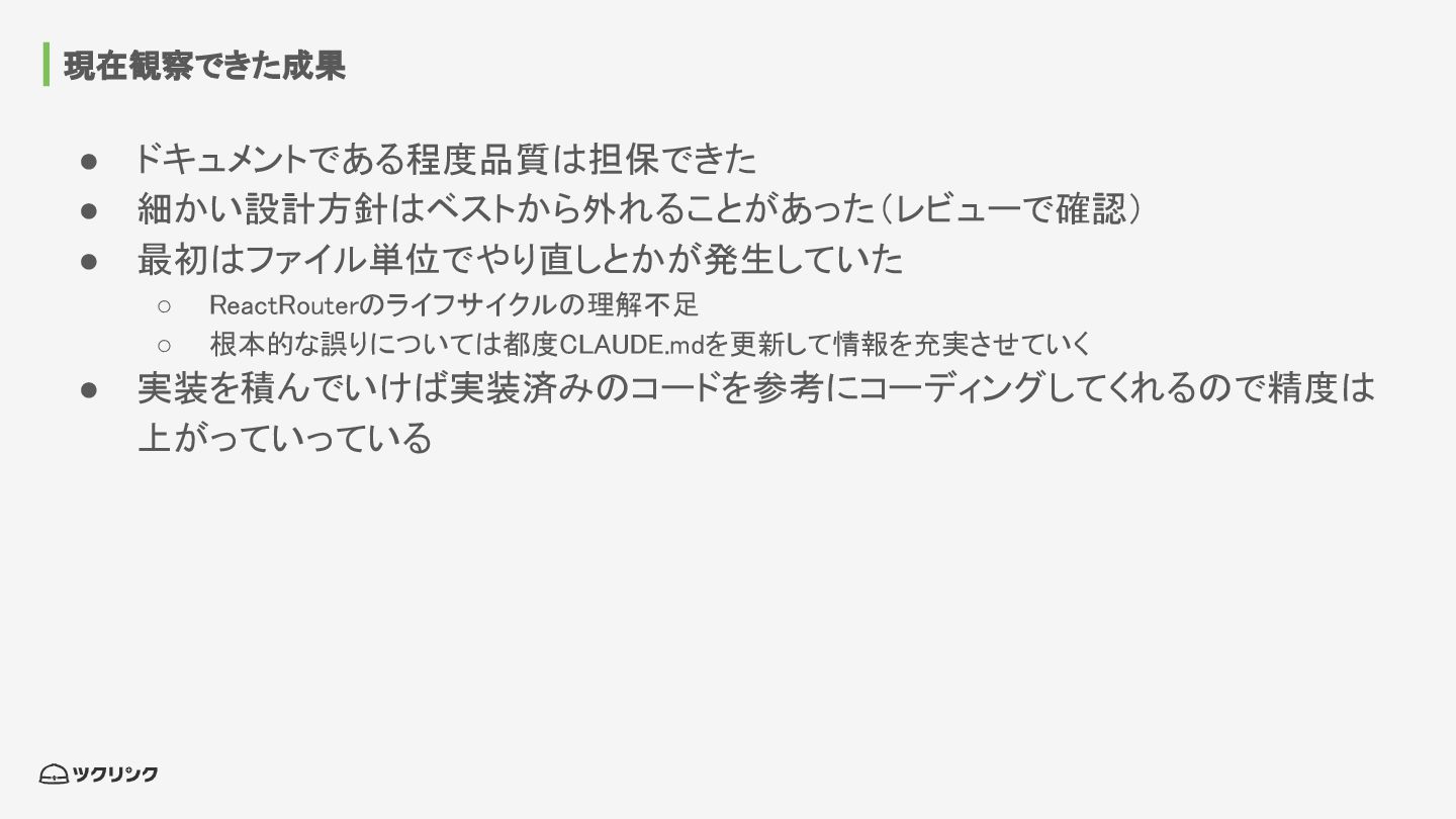 現在観察できた成果 • ドキュメントである程度品質は担保できた • 細かい設計方針はベストから外れることがあった(レビューで確認) • 最初はファイル単位でやり直しとかが発生していた ◦ ReactRouterのライフサイクルの理解不足