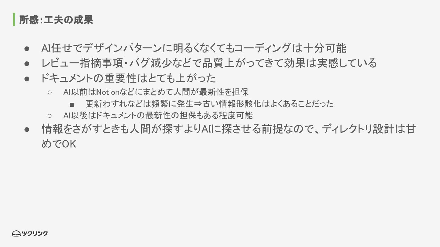 所感:工夫の成果 • AI任せでデザインパターンに明るくなくてもコーディングは十分可能 • レビュー指摘事項・バグ減少などで品質上がってきて効果は実感している • ドキュメントの重要性はとても上がった ◦ AI以前はNotionなどにまとめて人間が最新性を担保