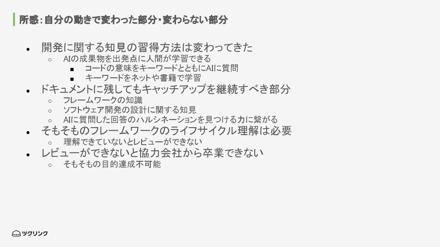 所感:自分の動きで変わった部分・変わらない部分 • 開発に関する知見の習得方法は変わってきた ◦ AIの成果物を出発点に人間が学習できる ▪ コードの意味をキーワードとともにAIに質問
