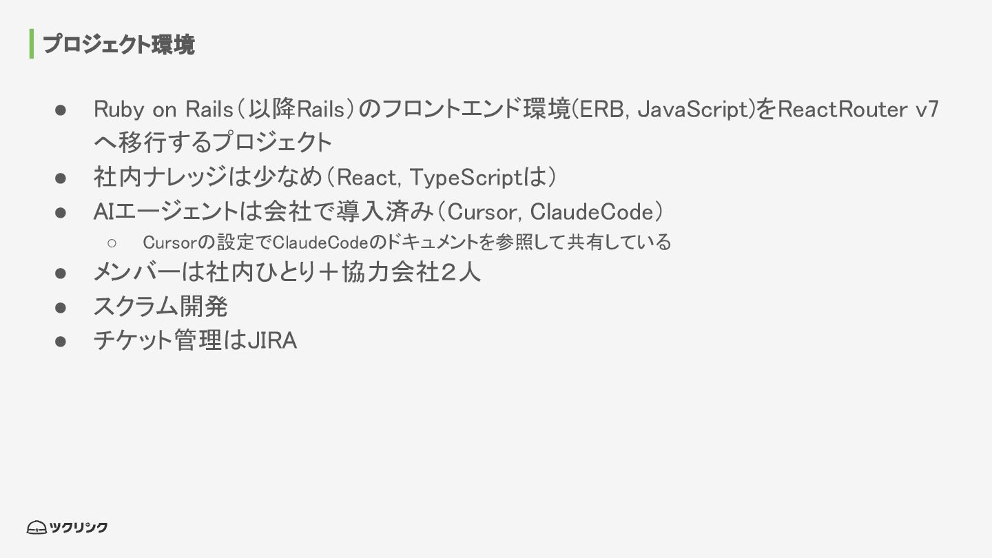 社内ナレッジは少なめ(React, TypeScriptは) • AIエージェントは会社で導入済み(Cursor, ClaudeCode) ◦ Cursorの設定でClaudeCodeのドキュメントを参照して共有している • メンバーは社内ひとり+協力会社2人 • スクラム開発 • チケット管理はJIRA