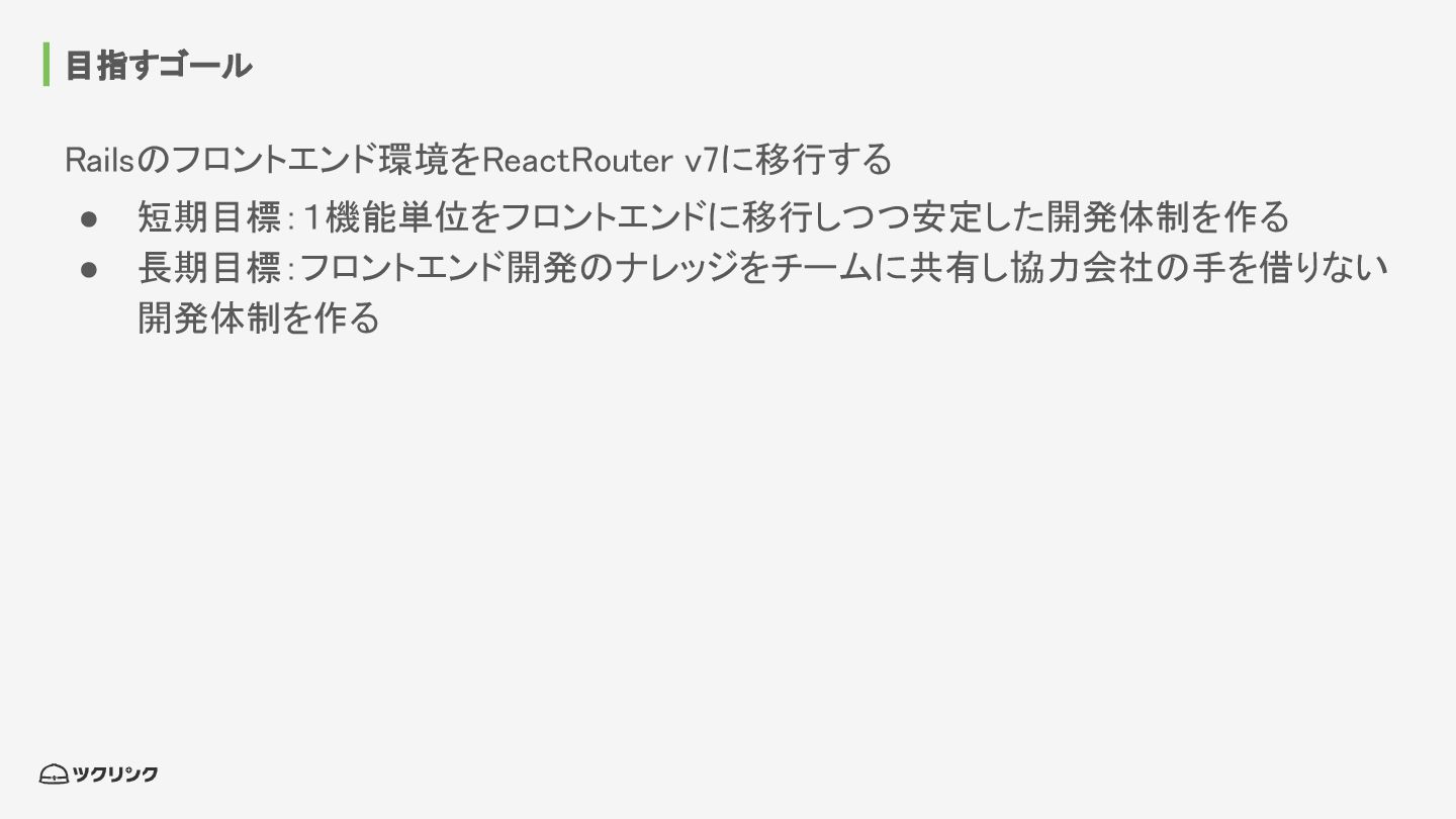目指すゴール Railsのフロントエンド環境をReactRouter v7に移行する • 短期目標:1機能単位をフロントエンドに移行しつつ安定した開発体制を作る • 長期目標:フロントエンド開発のナレッジをチームに共有し協力会社の手を借りない 開発体制を作る