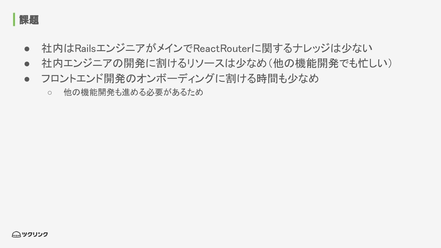 課題 • 社内はRailsエンジニアがメインでReactRouterに関するナレッジは少ない • 社内エンジニアの開発に割けるリソースは少なめ(他の機能開発でも忙しい) • フロントエンド開発のオンボーディングに割ける時間も少なめ ◦ 他の機能開発も進める必要があるため