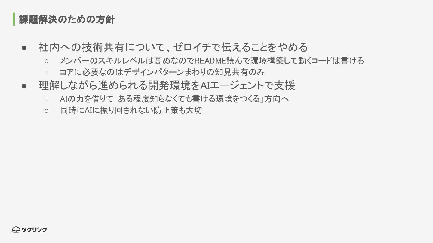 • 理解しながら進められる開発環境をAIエージェントで支援 ◦ AIの力を借りて「ある程度知らなくても書ける環境をつくる」方向へ ◦ 同時にAIに振り回されない防止策も大切