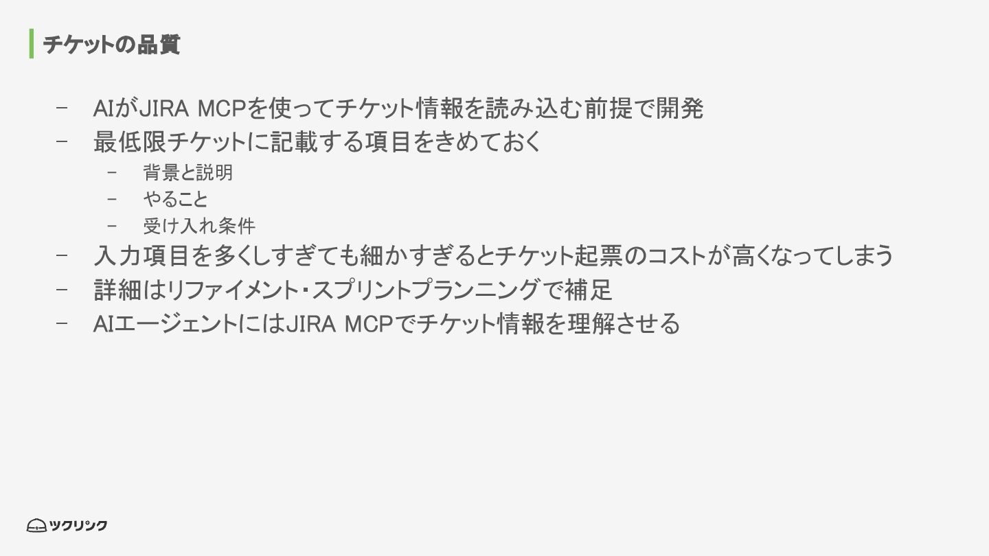 チケットの品質 - AIがJIRA MCPを使ってチケット情報を読み込む前提で開発 - 最低限チケットに記載する項目をきめておく - 背景と説明 -