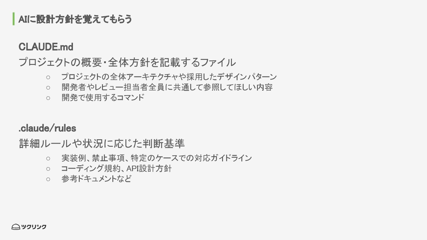 AIに設計方針を覚えてもらう CLAUDE.md プロジェクトの概要・全体方針を記載するファイル ◦ プロジェクトの全体アーキテクチャや採用したデザインパターン ◦ 開発者やレビュー担当者全員に共通して参照してほしい内容