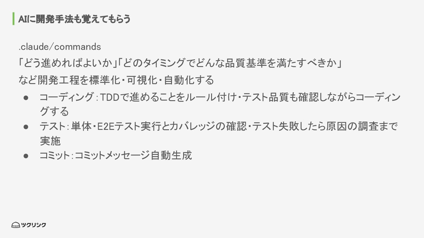AIに開発手法も覚えてもらう .claude/commands 「どう進めればよいか」「どのタイミングでどんな品質基準を満たすべきか」 など開発工程を標準化・可視化・自動化する • コーディング:TDDで進めることをルール付け・テスト品質も確認しながらコーディン グする • テスト:単体・E2Eテスト実行とカバレッジの確認・テスト失敗したら原因の調査まで