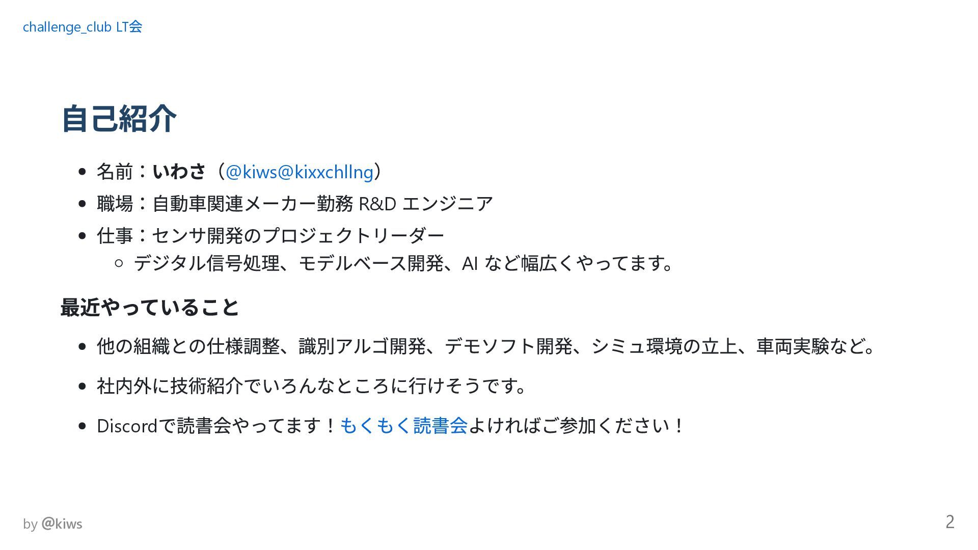 他の組織との仕様調整、識別アルゴ開発、デモソフト開発、シミュ環境の立上、車両実験など。 社内外に技術紹介でいろんなところに行けそうです。 Discord で読書会やってます!もくもく読書会よければご参加ください! challenge_club LT 会 by @kiws 2