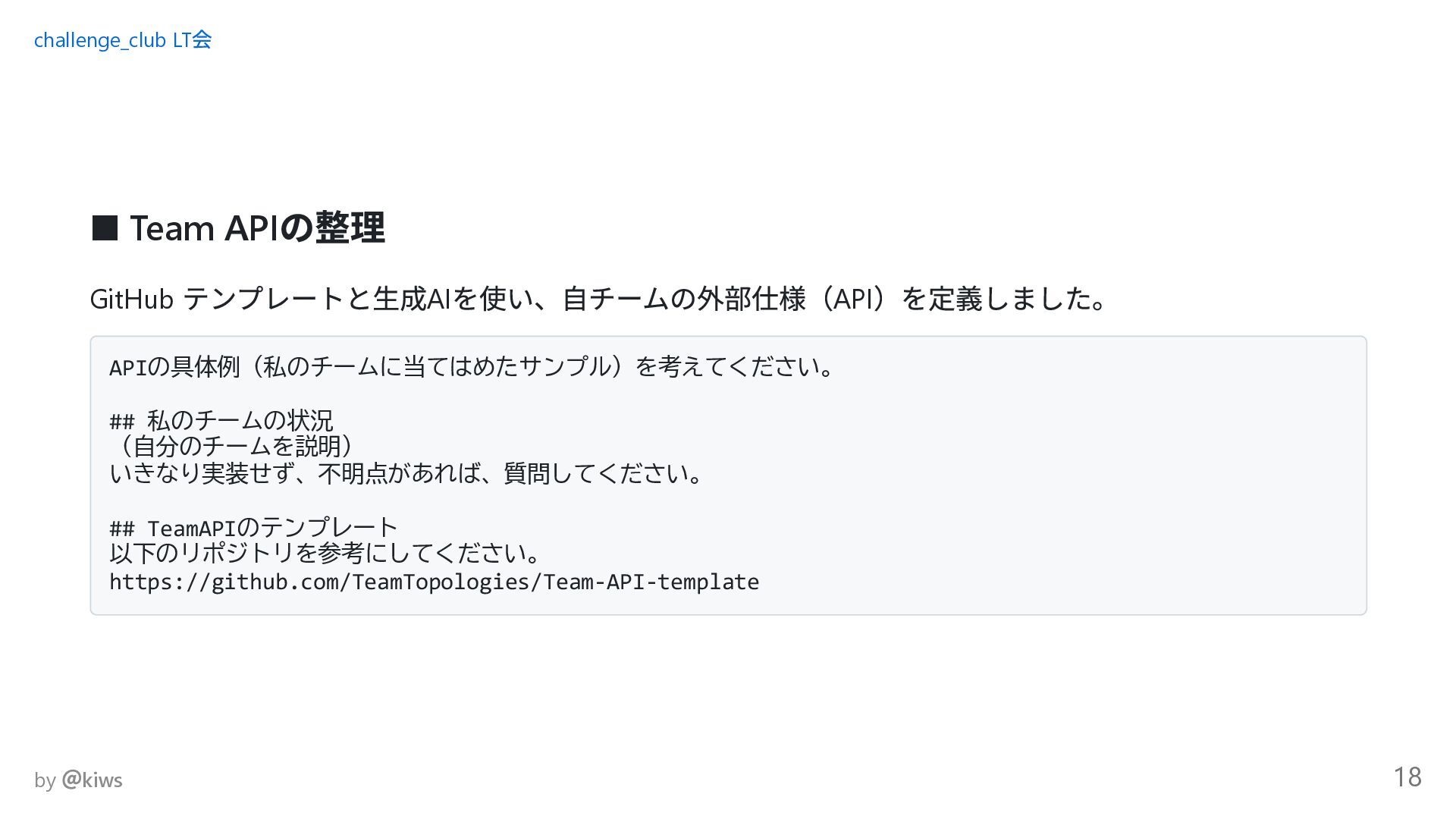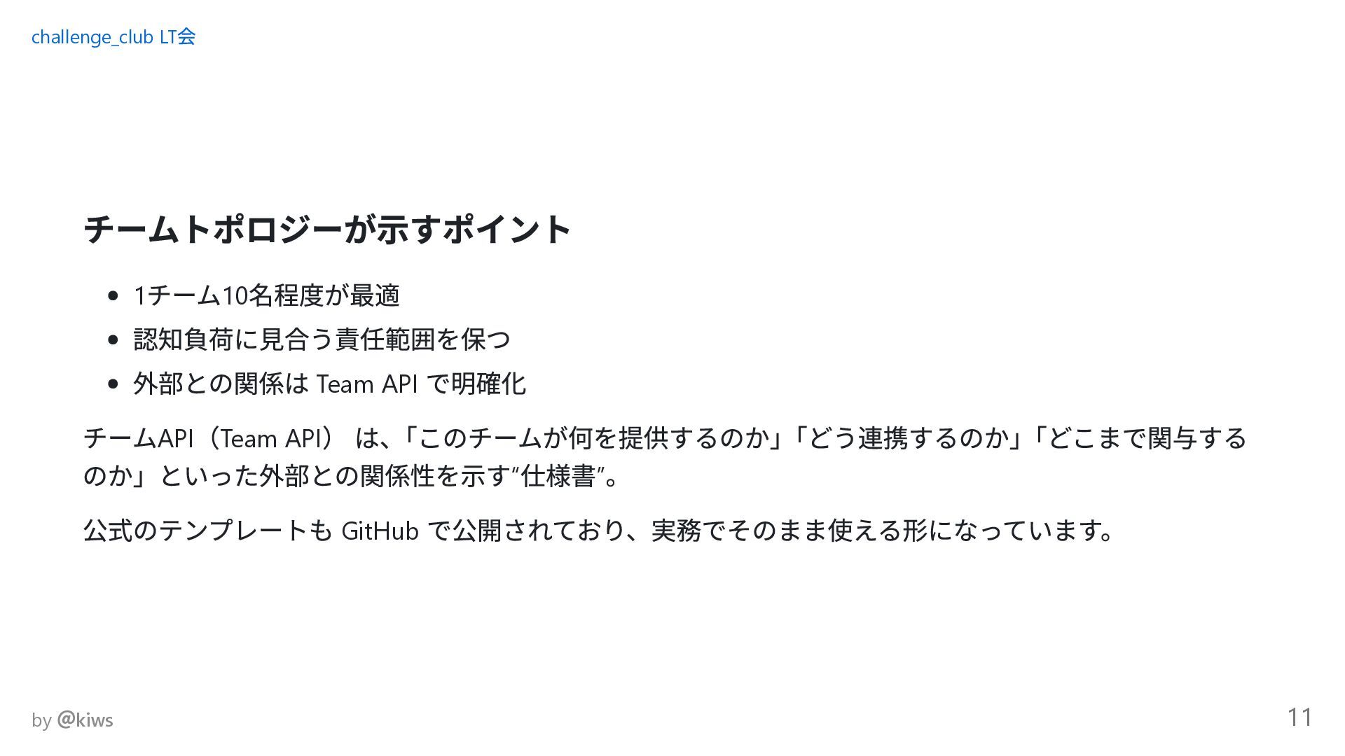 (Team API ) は、 「このチームが何を提供するのか」 「どう連携するのか」 「どこまで関与する のか」といった外部との関係性を示す“ 仕様書” 。 公式のテンプレートも GitHub で公開されており、実務でそのまま使える形になっています。 challenge_club LT 会 by @kiws 11