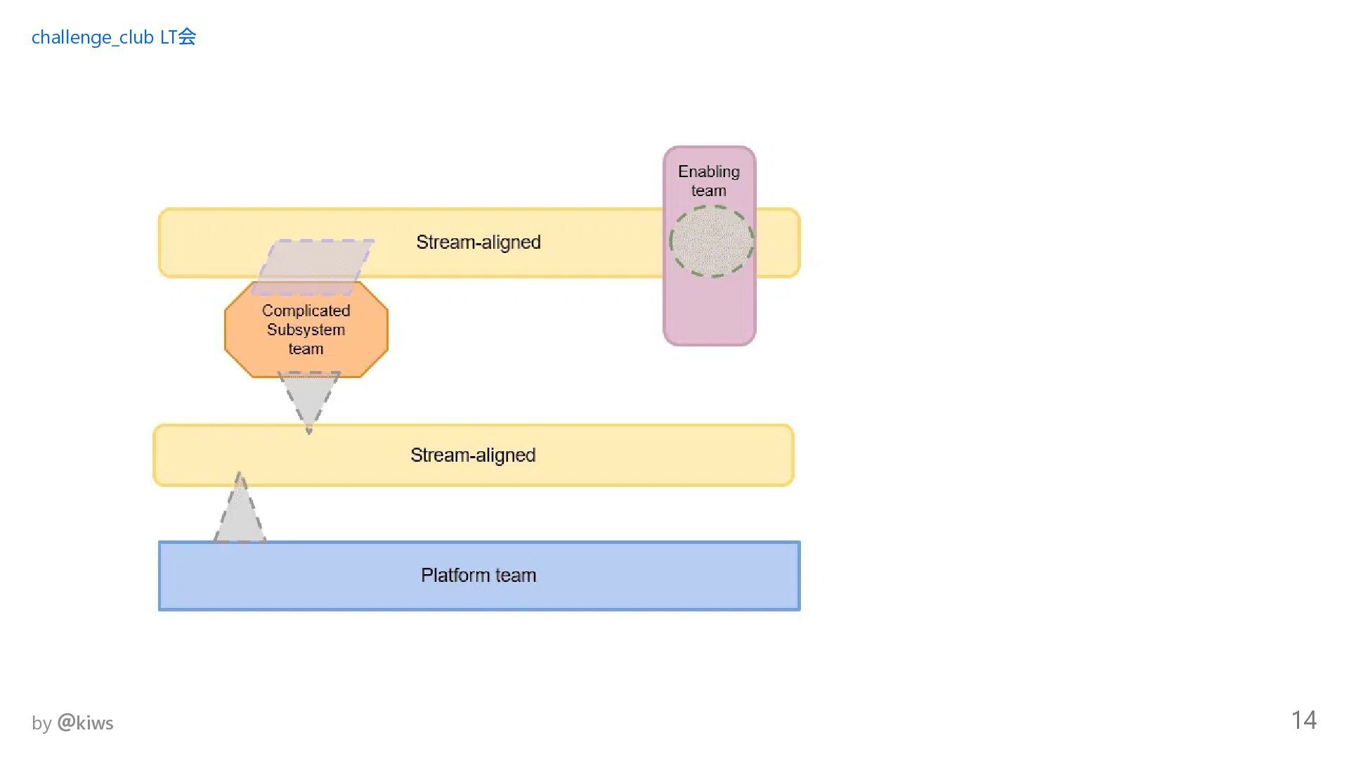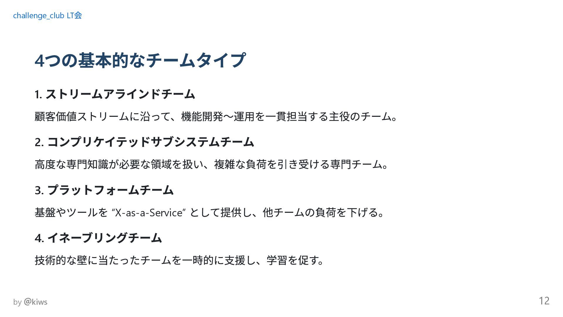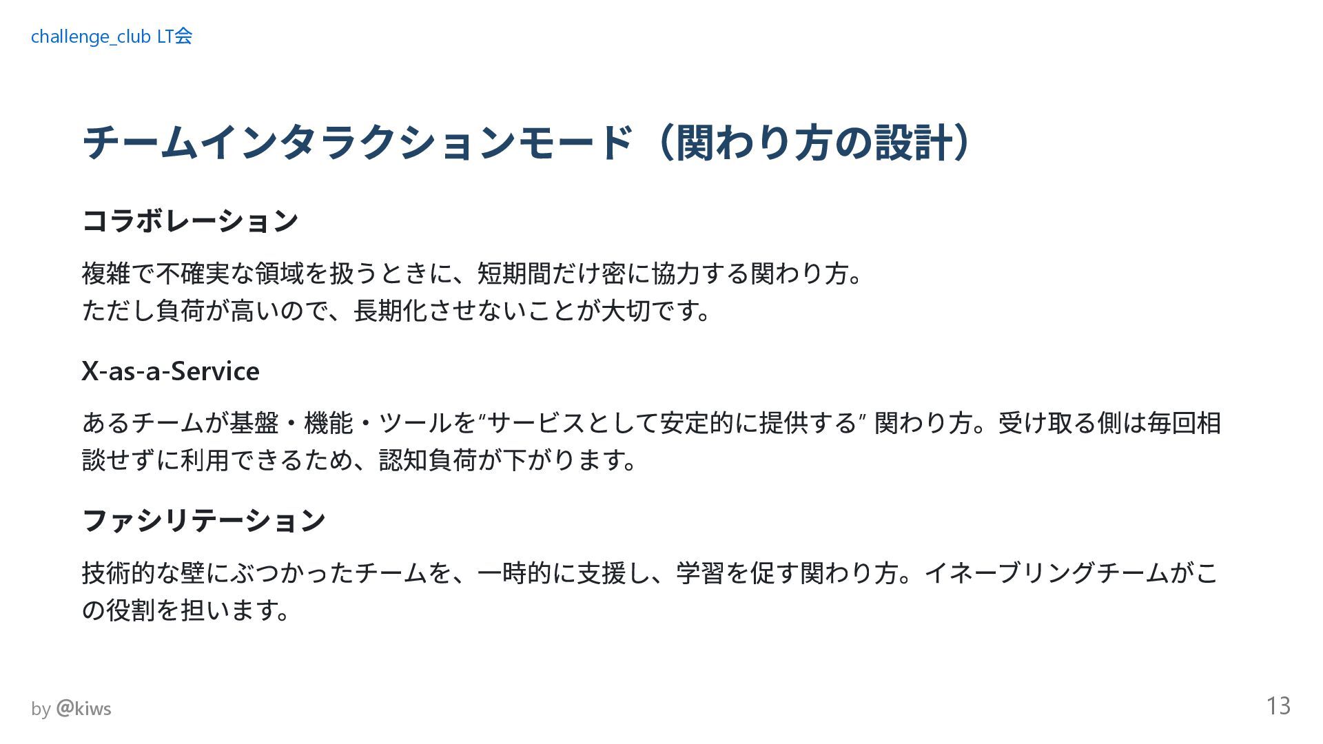 基盤やツールを “X-as-a-Service” として提供し、他チームの負荷を下げる。 4. イネーブリングチーム 技術的な壁に当たったチームを一時的に支援し、学習を促す。 challenge_club LT 会 by @kiws 12