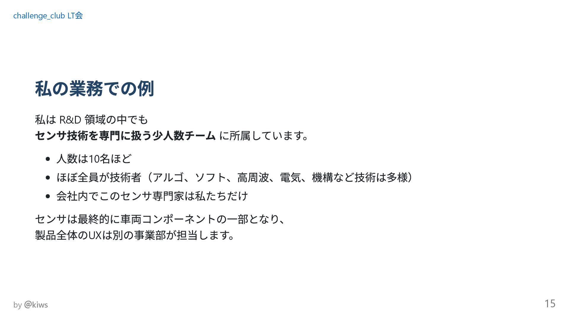 センサは最終的に車両コンポーネントの一部となり、 製品全体のUX は別の事業部が担当します。 challenge_club LT 会 by @kiws 15