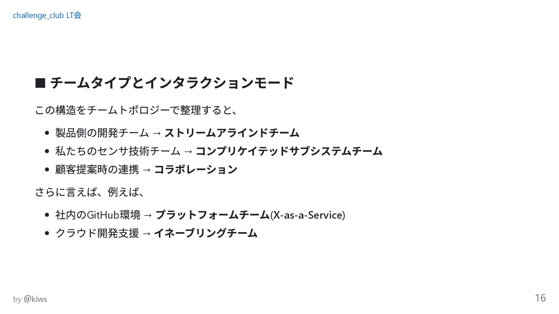 → コラボレーション さらに言えば、例えば、 社内のGitHub 環境 → プラットフォームチーム(X-as-a-Service) クラウド開発支援 → イネーブリングチーム challenge_club LT 会 by @kiws 16