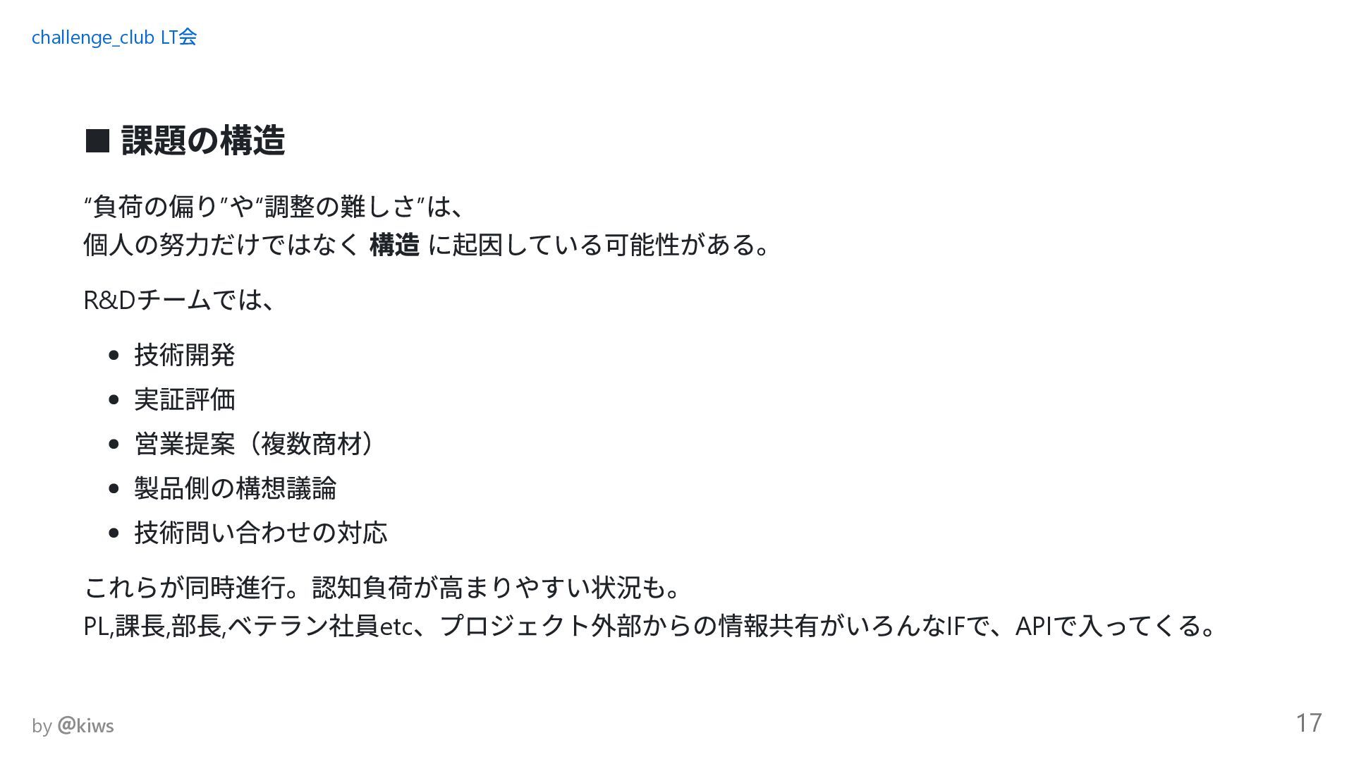 R&D チームでは、 技術開発 実証評価 営業提案(複数商材) 製品側の構想議論 技術問い合わせの対応 これらが同時進行。認知負荷が高まりやすい状況も。 PL, 課長, 部長, ベテラン社員etc 、プロジェクト外部からの情報共有がいろんなIF で、API で入ってくる。 challenge_club LT 会 by @kiws 17