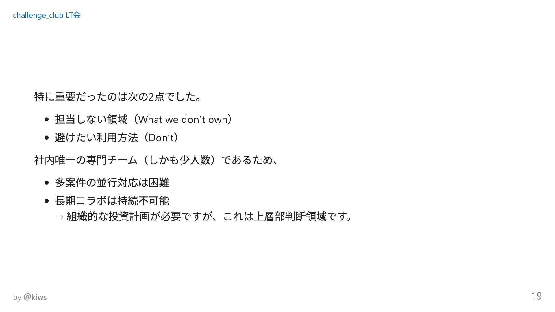多案件の並行対応は困難 長期コラボは持続不可能 → 組織的な投資計画が必要ですが、これは上層部判断領域です。 challenge_club LT 会 by @kiws 19