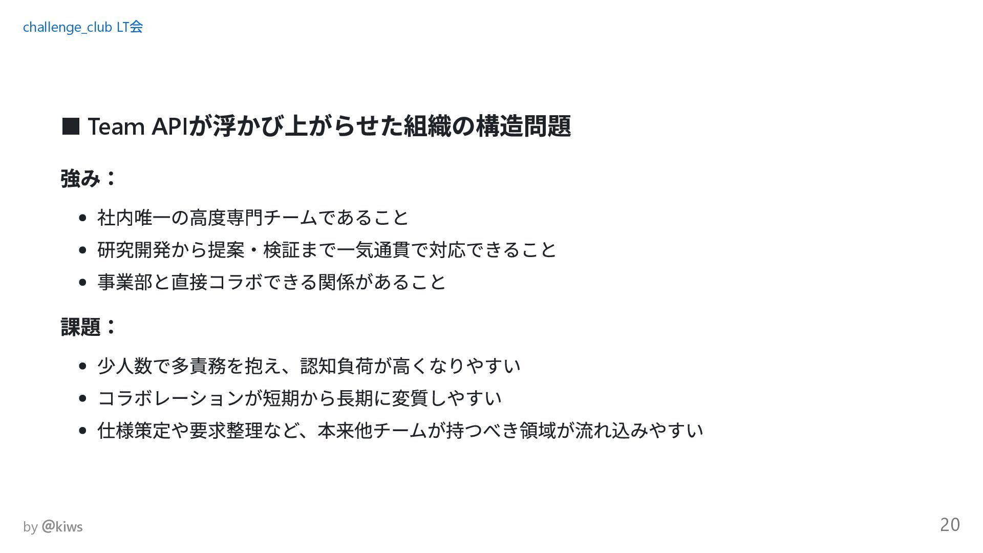 コラボレーションが短期から長期に変質しやすい 仕様策定や要求整理など、本来他チームが持つべき領域が流れ込みやすい challenge_club LT 会 by @kiws 20