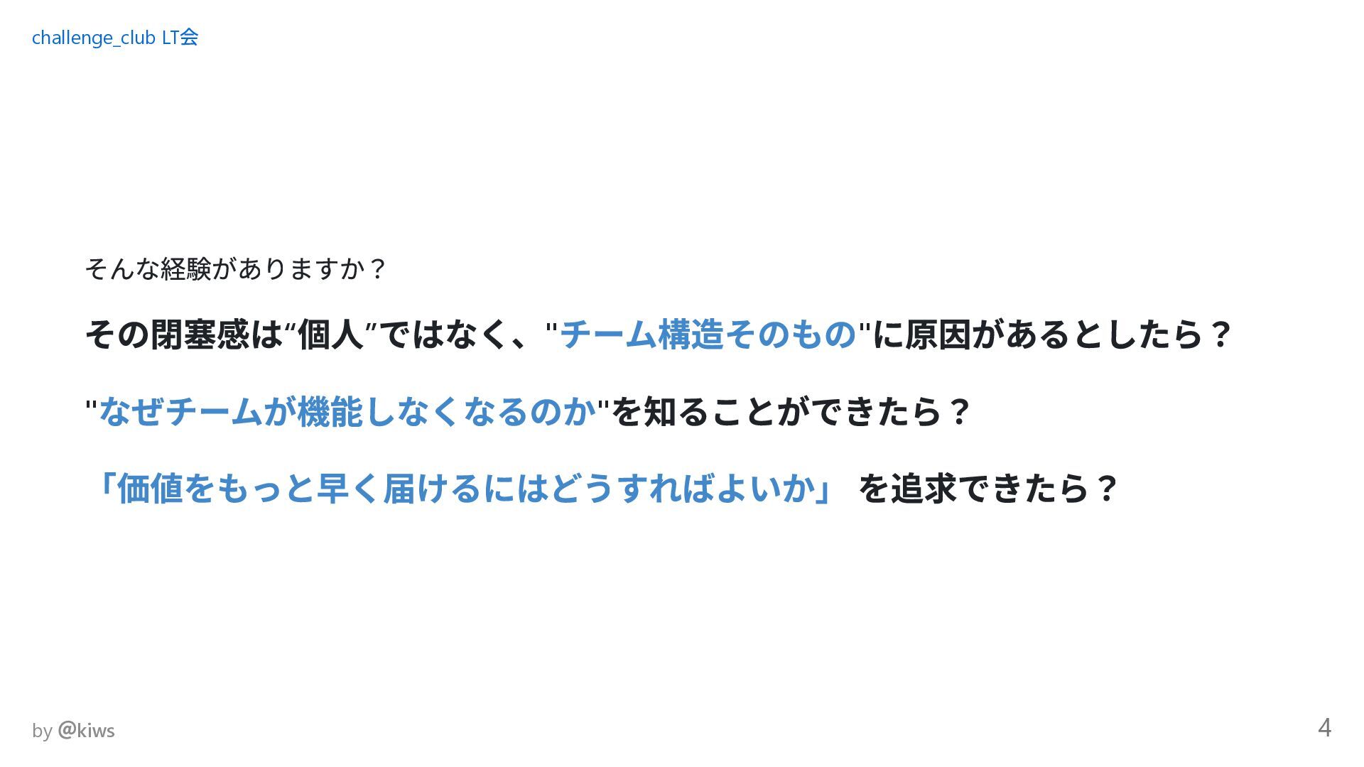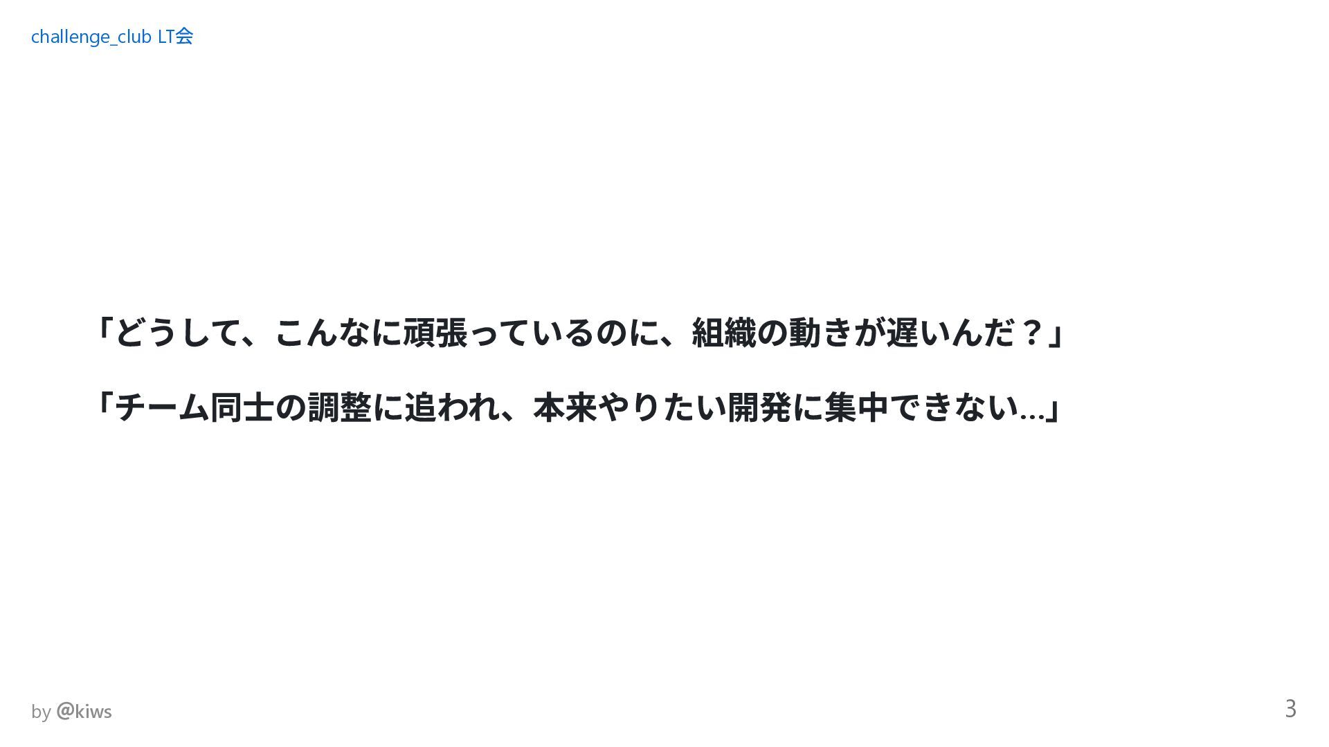 「どうして、こんなに頑張っているのに、組織の動きが遅いんだ?」 「チーム同士の調整に追われ、本来やりたい開発に集中できない… 」 challenge_club LT 会 by @kiws 3