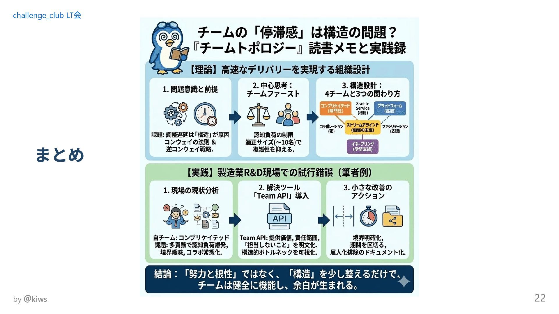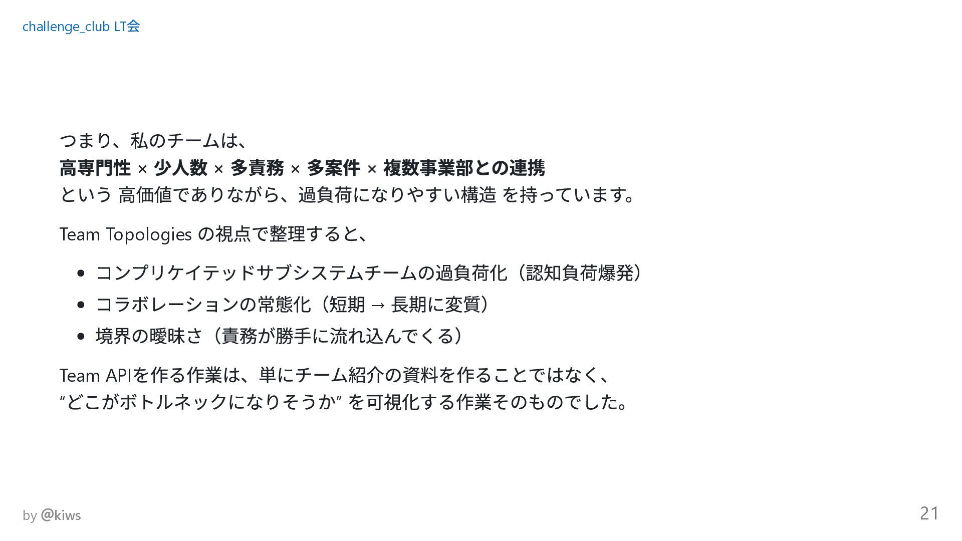 という 高価値でありながら、過負荷になりやすい構造 を持っています。 Team Topologies の視点で整理すると、 コンプリケイテッドサブシステムチームの過負荷化(認知負荷爆発) コラボレーションの常態化(短期 → 長期に変質) 境界の曖昧さ(責務が勝手に流れ込んでくる) Team API を作る作業は、単にチーム紹介の資料を作ることではなく、 “ どこがボトルネックになりそうか” を可視化する作業そのものでした。 challenge_club LT 会 by @kiws 21