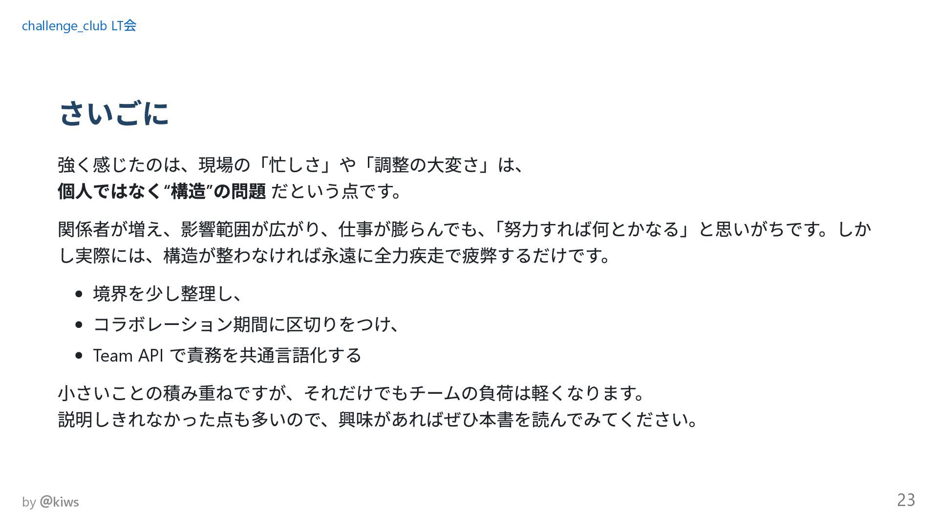 コラボレーション期間に区切りをつけ、 Team API で責務を共通言語化する 小さいことの積み重ねですが、それだけでもチームの負荷は軽くなります。 説明しきれなかった点も多いので、興味があればぜひ本書を読んでみてください。 challenge_club LT 会 by @kiws 23