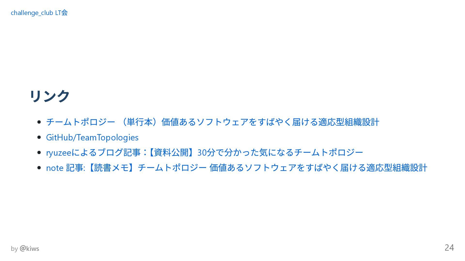 【読書メモ】チームトポロジー 価値あるソフトウェアをすばやく届ける適応型組織設計 challenge_club LT 会 by @kiws 24
