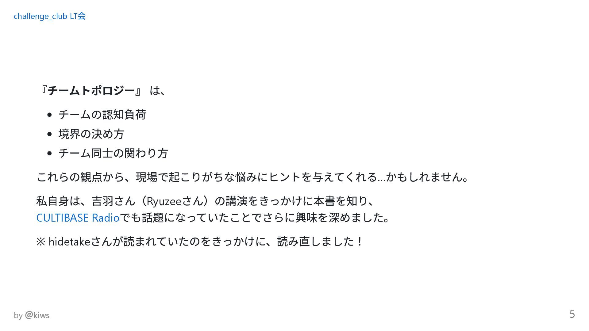 Radio でも話題になっていたことでさらに興味を深めました。 ※ hidetake さんが読まれていたのをきっかけに、読み直しました! challenge_club LT 会 by @kiws 5