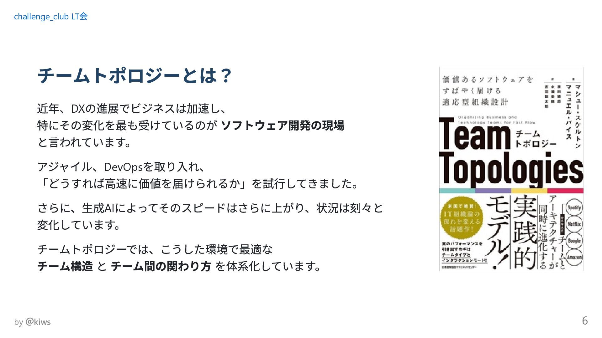 によってそのスピードはさらに上がり、状況は刻々と 変化しています。 チームトポロジーでは、こうした環境で最適な チーム構造 と チーム間の関わり方 を体系化しています。 challenge_club LT 会 by @kiws 6