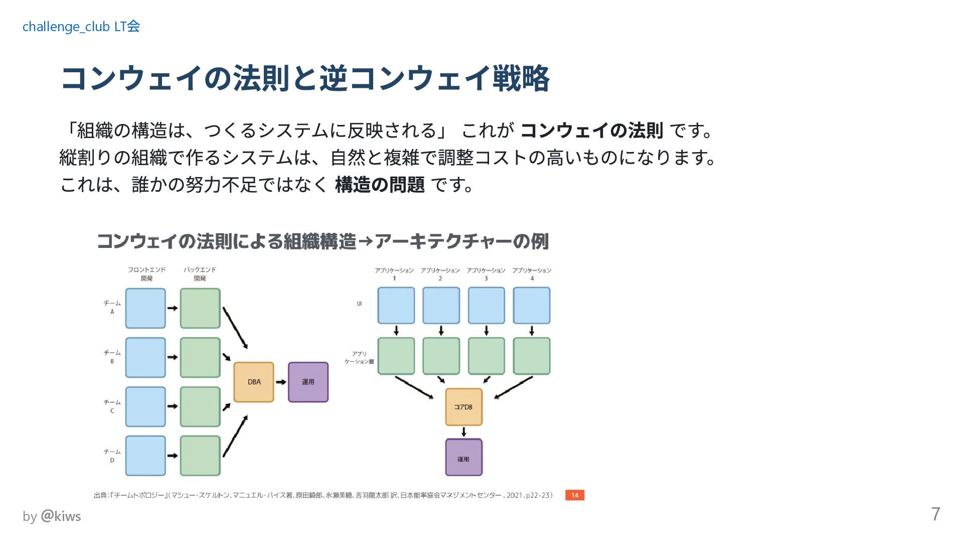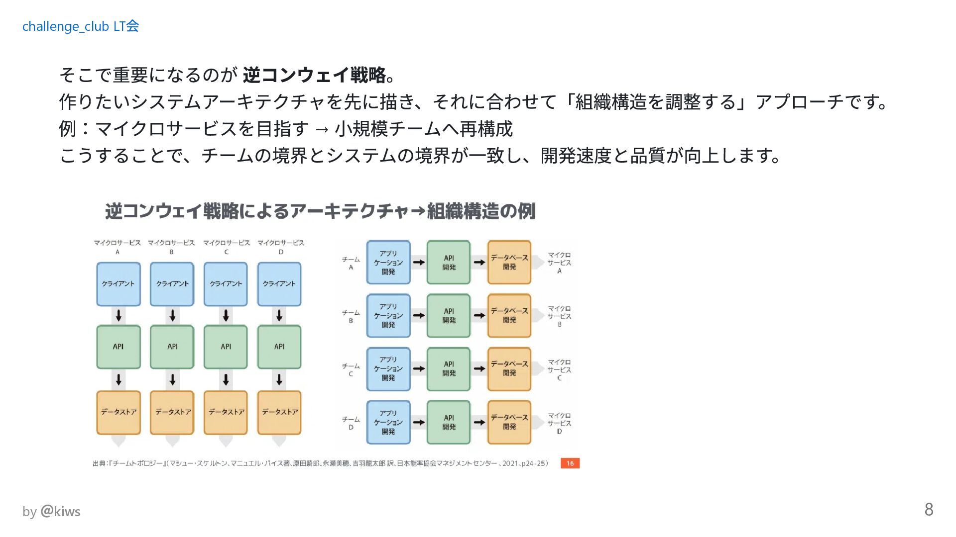 そこで重要になるのが 逆コンウェイ戦略。 作りたいシステムアーキテクチャを先に描き、それに合わせて「組織構造を調整する」アプローチです。 例:マイクロサービスを目指す → 小規模チームへ再構成 こうすることで、チームの境界とシステムの境界が一致し、開発速度と品質が向上します。 challenge_club LT 会