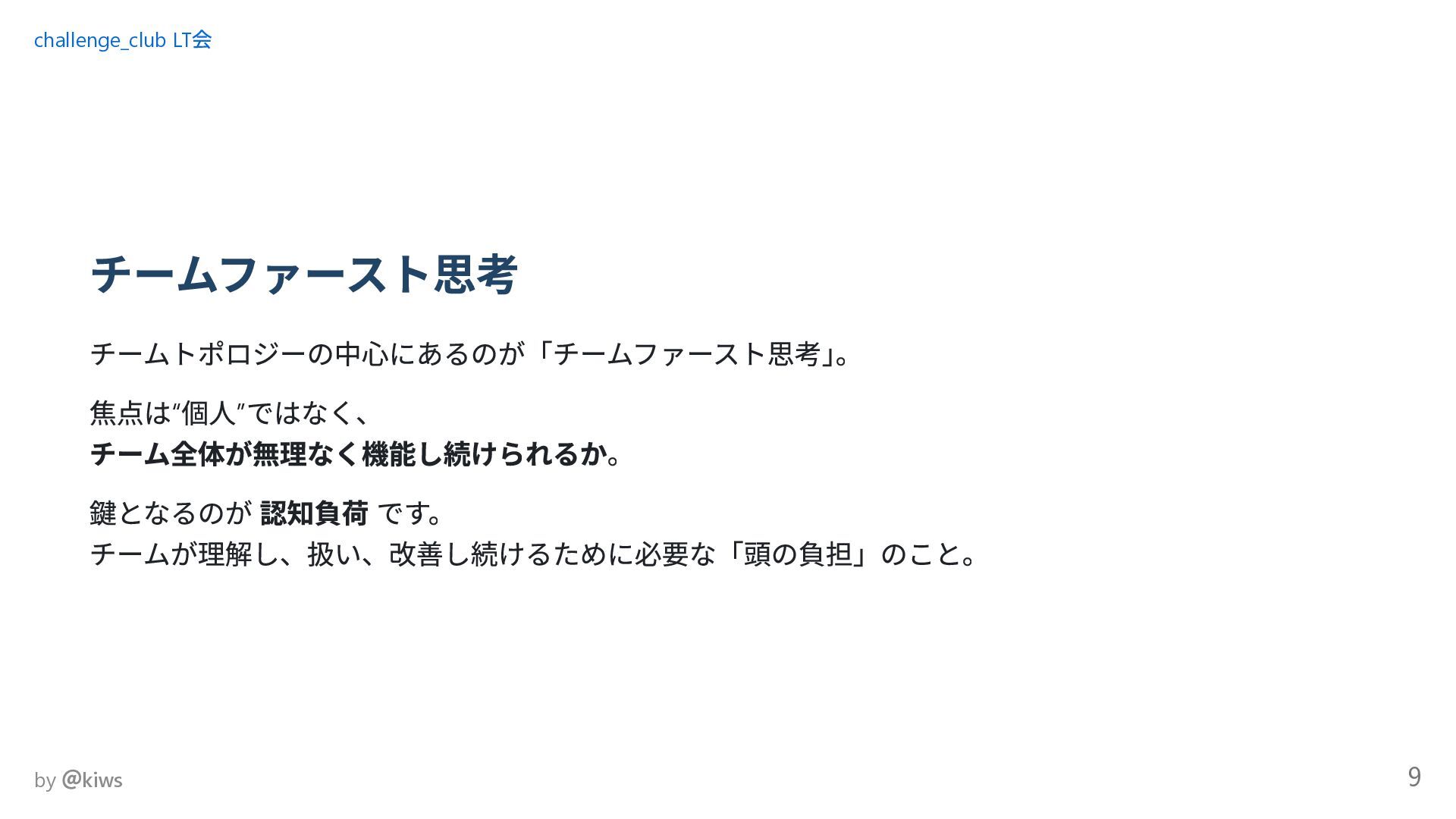 チームが理解し、扱い、改善し続けるために必要な「頭の負担」のこと。 challenge_club LT 会 by @kiws 9