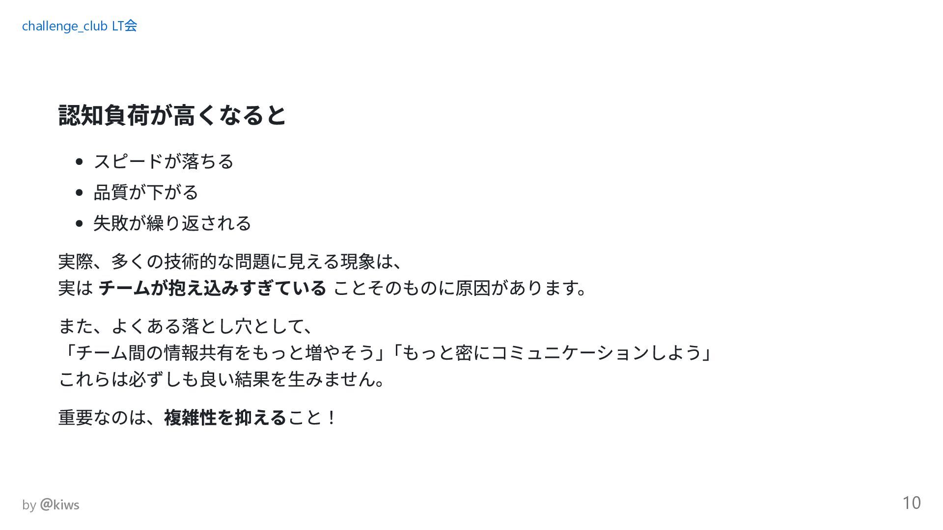 「もっと密にコミュニケーションしよう」 これらは必ずしも良い結果を生みません。 重要なのは、複雑性を抑えること! challenge_club LT 会 by @kiws 10