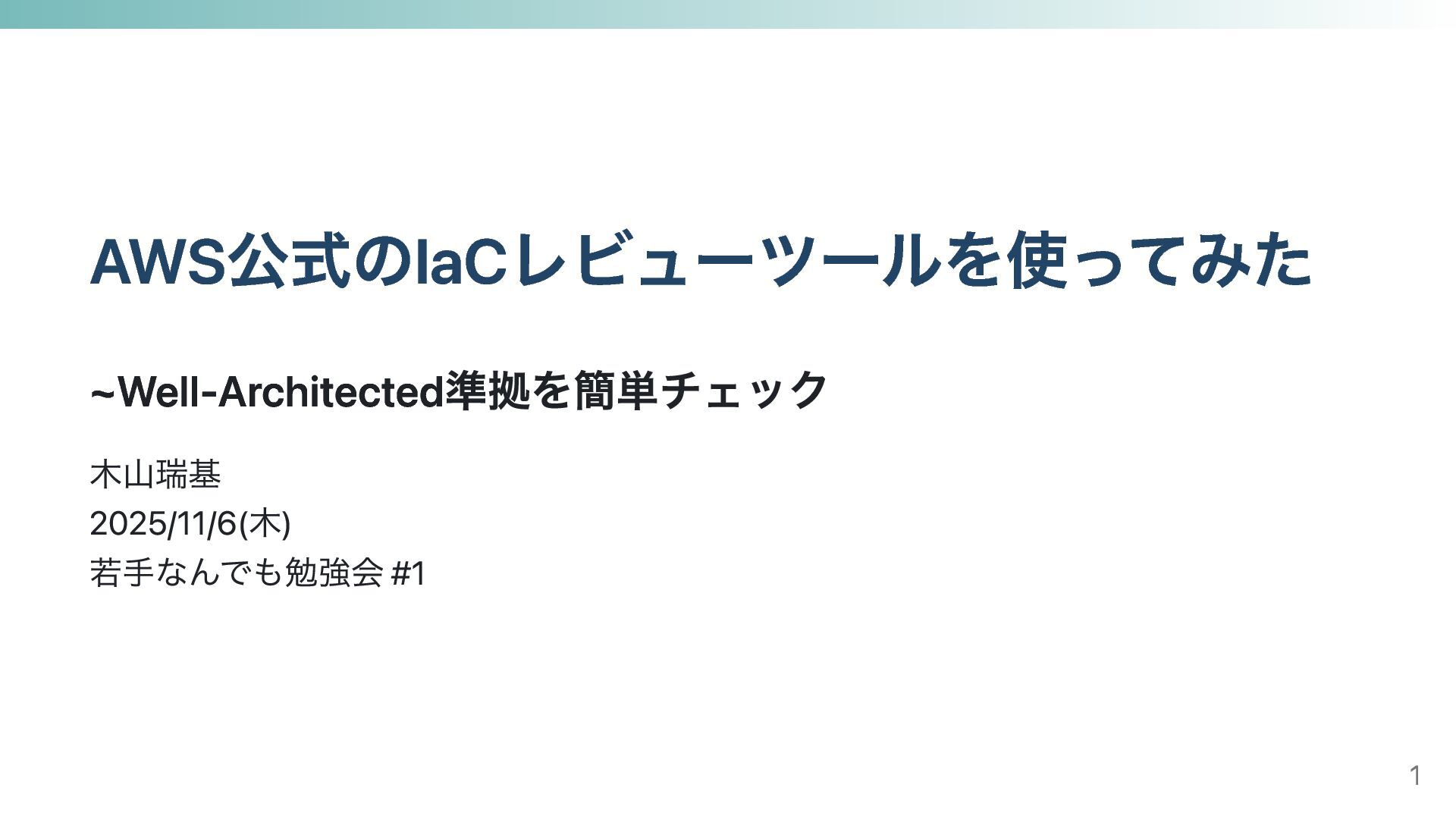 AWS公式のIaCレビューツールを使ってみた ~Well-Architected準拠を簡単チェック 木山瑞基 2025/11/6(木) 若手なんでも勉強会 #1 1