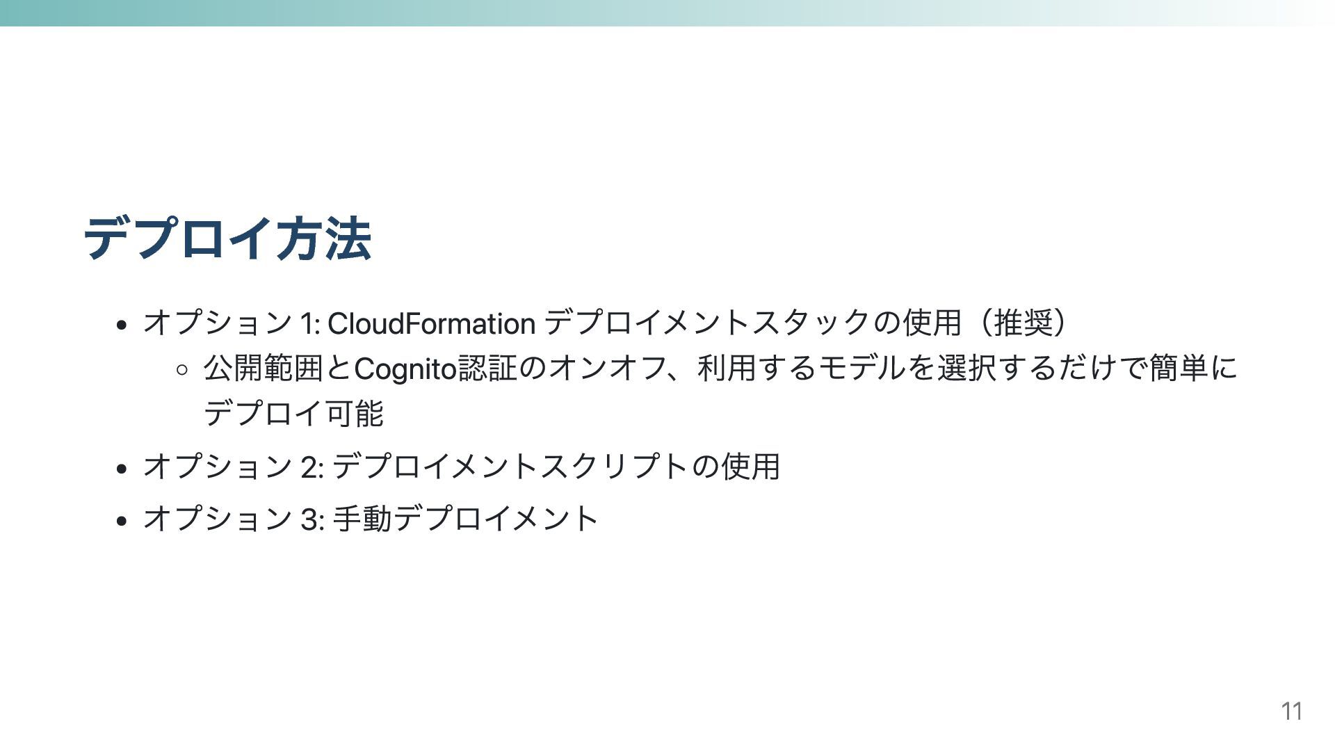 デプロイ方法 オプション 1: CloudFormation デプロイメントスタックの使用(推奨) 公開範囲とCognito認証のオンオフ、利用するモデルを選択するだけで簡単に デプロイ可能 オプション 2: デプロイメントスクリプトの使用
