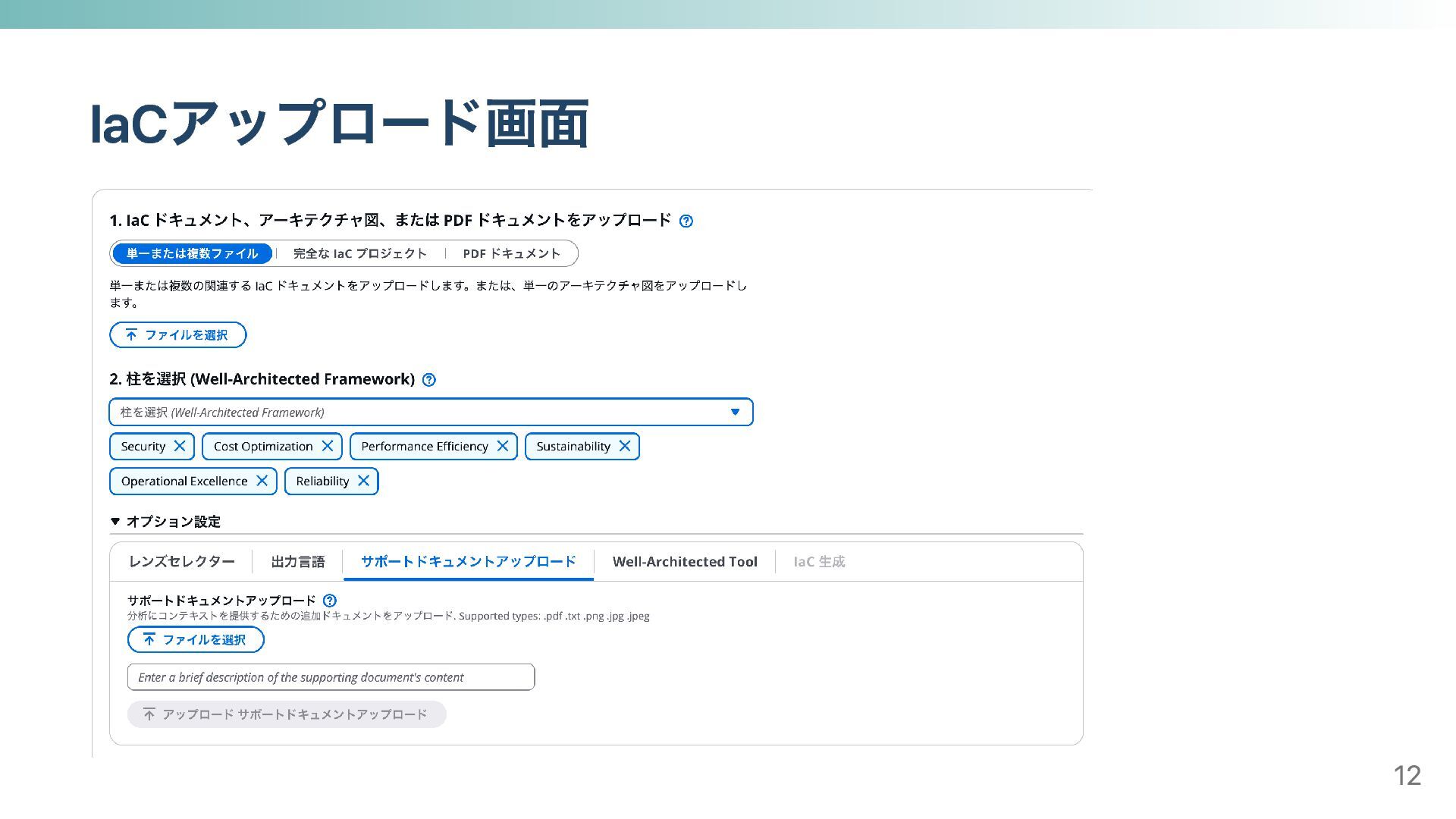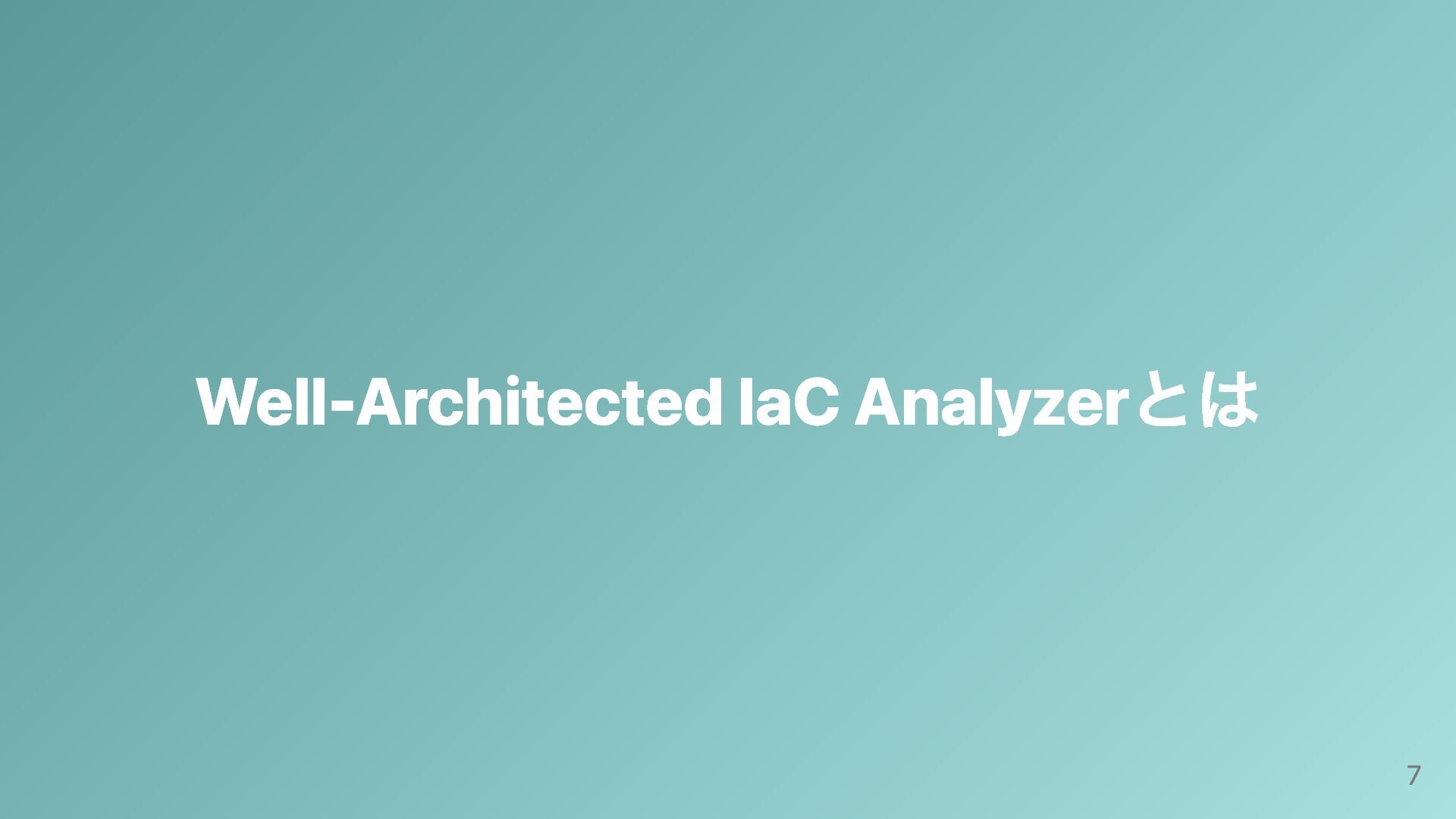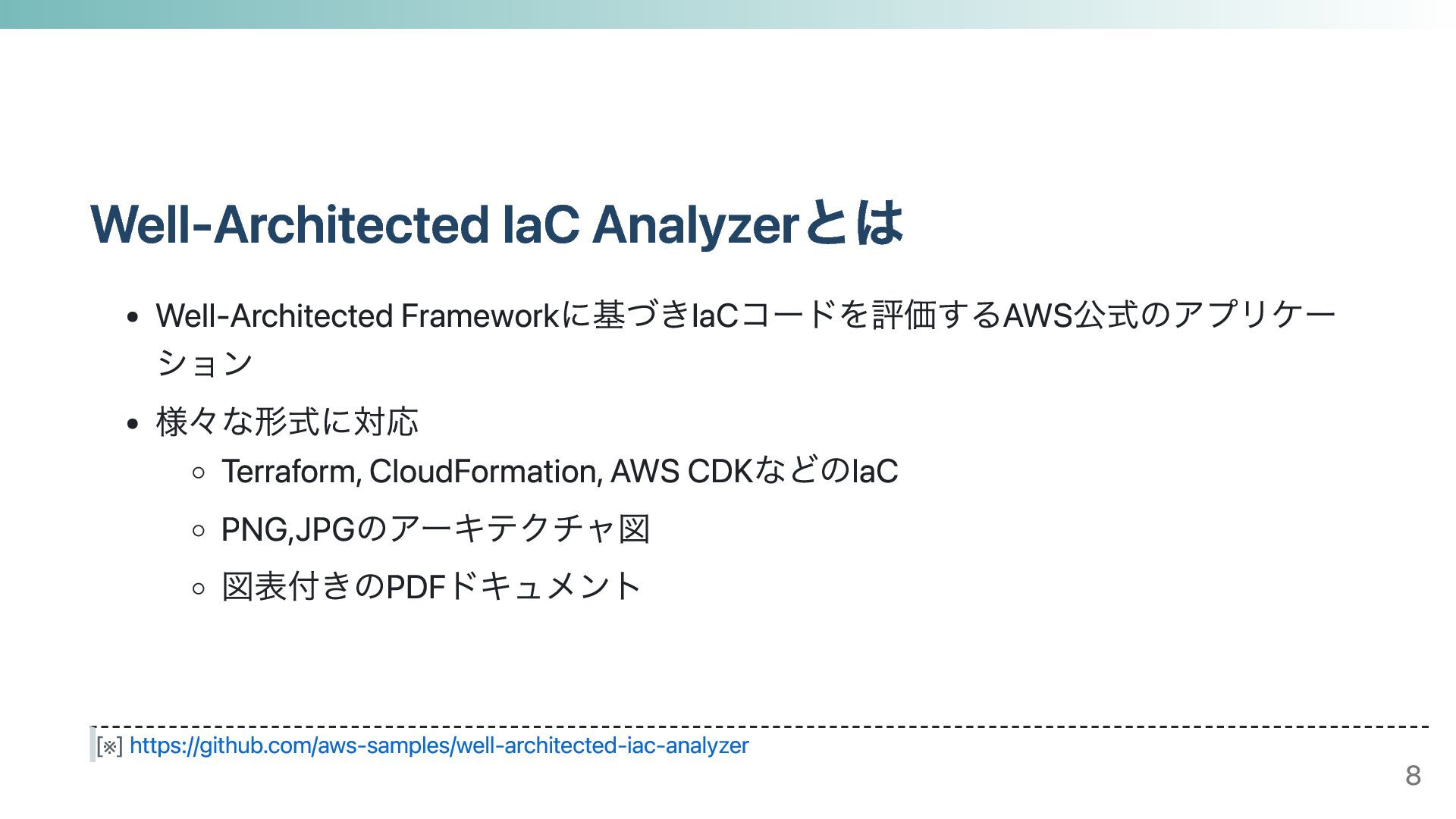 Well-Architected IaC Analyzerとは Well-Architected Frameworkに基づきIaCコードを評価するAWS公式のアプリケー ション 様々な形式に対応 Terraform, CloudFormation, AWS