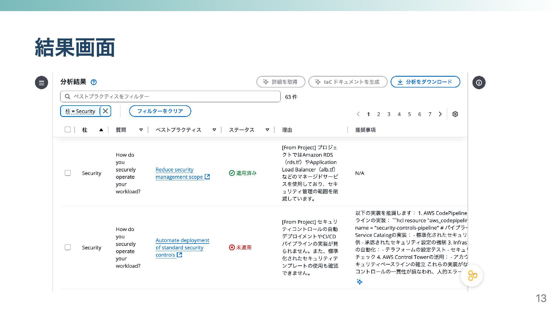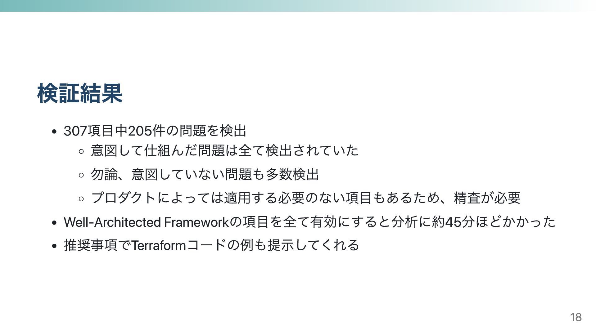 検証結果 307項目中205件の問題を検出 意図して仕組んだ問題は全て検出されていた 勿論、意図していない問題も多数検出 プロダクトによっては適用する必要のない項目もあるため、精査が必要 Well-Architected Frameworkの項目を全て有効にすると分析に約45分ほどかかった 推奨事項でTerraformコードの例も提示してくれる 18